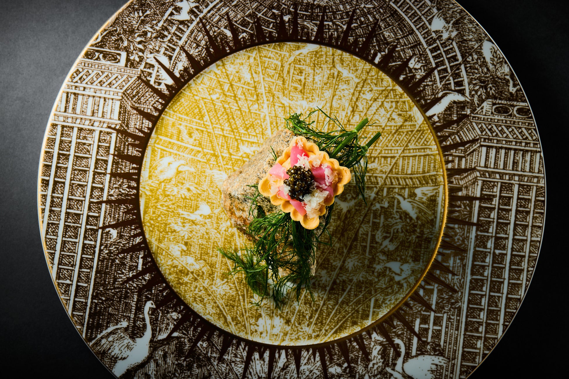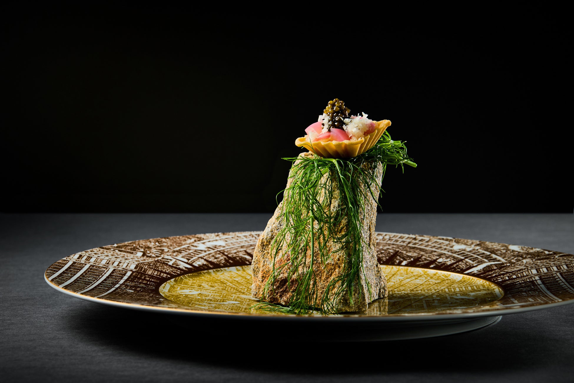 大阪のシンボルといえば、豊臣秀吉が築いた大阪城。築城当時、石垣に使用していたとされる庵治石を器に見立て、大阪産の卵を使用したタルトを大胆に盛り付けたアミューズ。シェフが描く大阪絵巻の始まりに、期待感が高まります。