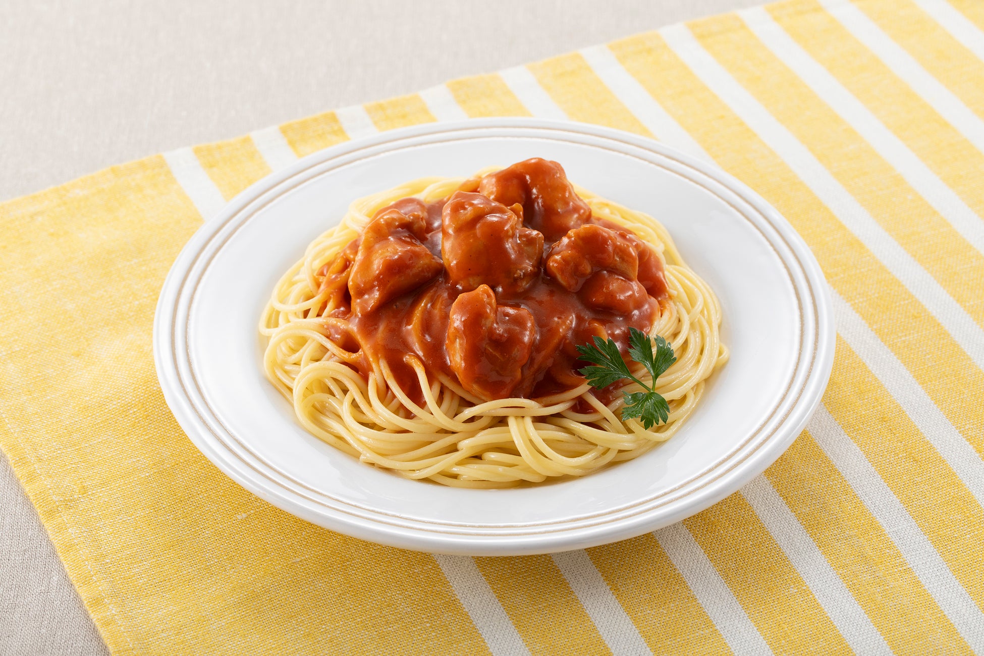 旨みのあるトマトソースが鶏肉によく合い、ガーリック、ナツメッグ、オレガノの香りが引き立つ、