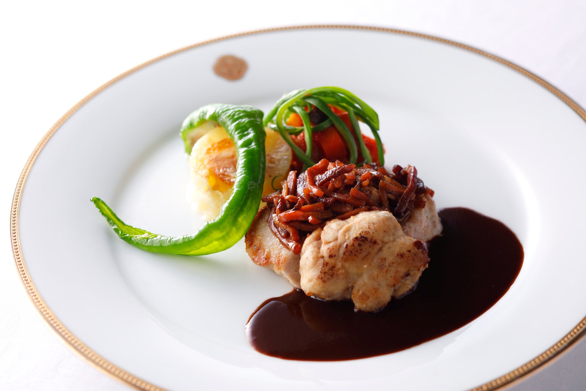 肉料理では、仔牛ロース肉とリードヴォーをソテーでお召し上がりいただけます。仔牛の上にはハムやベーコン、牛タンの生ハムを刻んだものを乗せ、食べ応えのある一皿に仕上げました。夏の味覚をご堪能いただけるよう、ナスのトマト煮を添えています。
