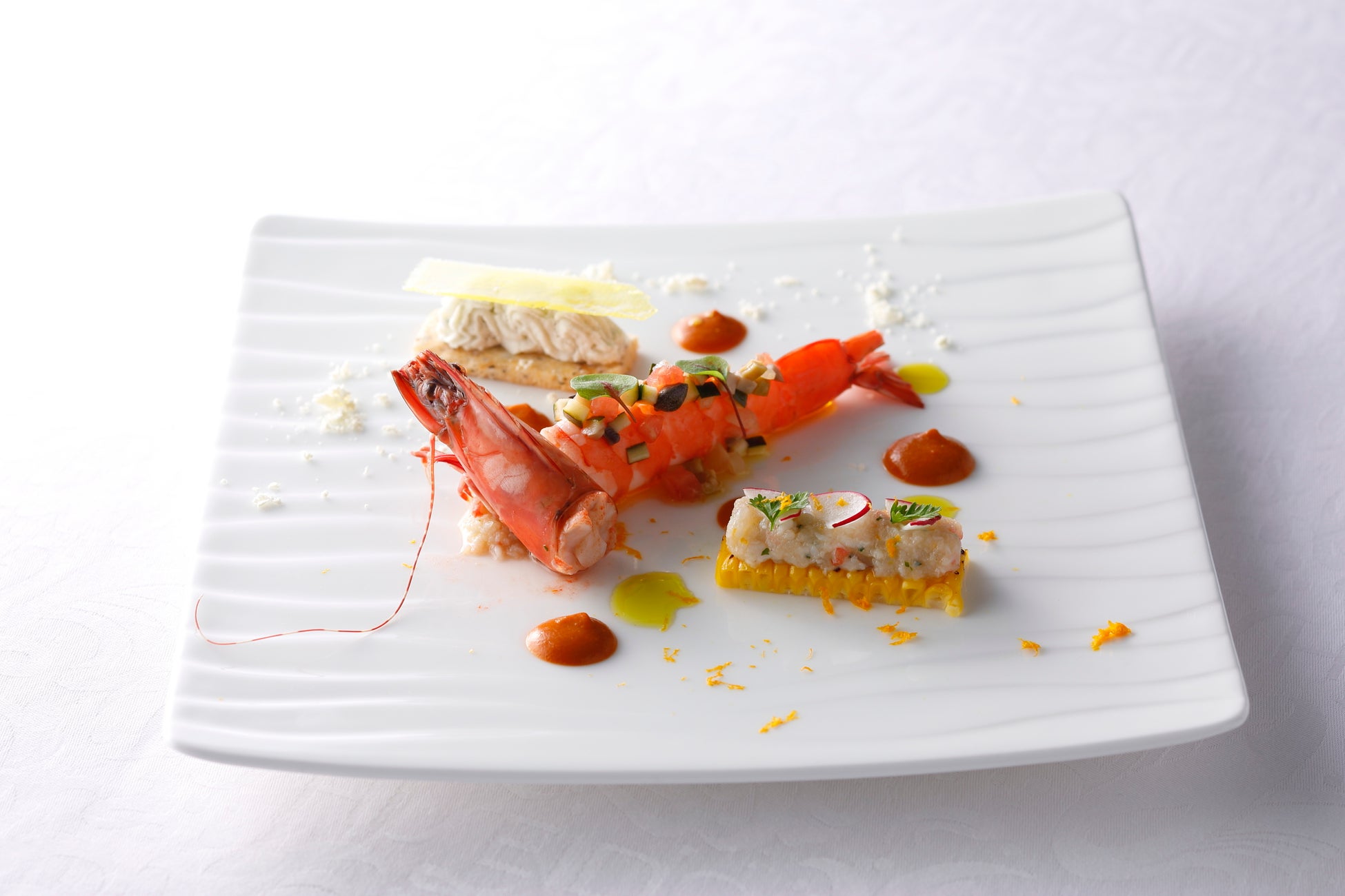 和歌山県産赤足エビのエチュベとティエド クリュスタッセソース(写真上)