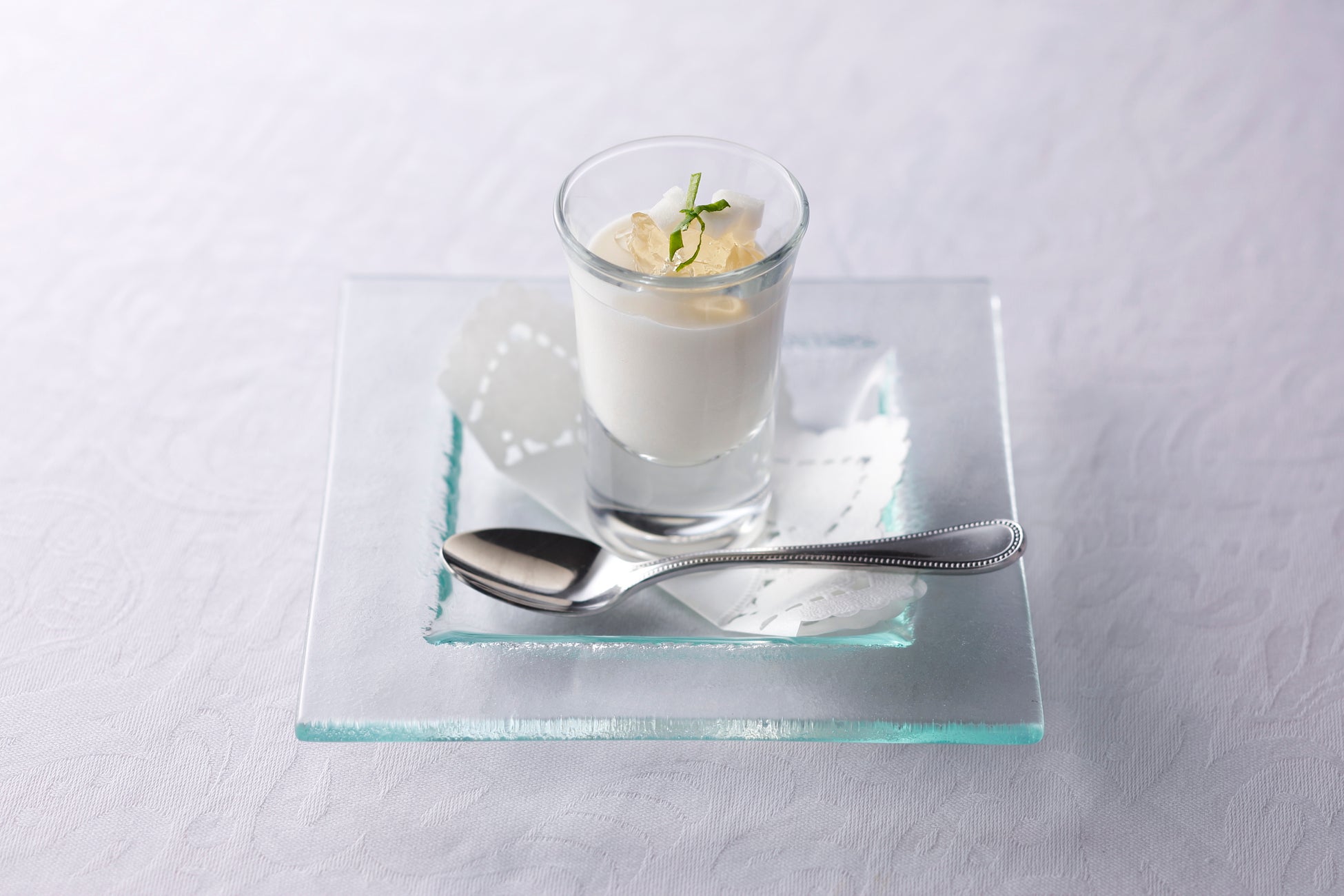 コースを締めくくるデザートは、バナナとマンゴーのマリネやココナッツのムースなど、夏にぴったりな味わいをお楽しみいただけます。廃材になってしまうカカオパルプを活用したソルベやジュレはフルーティーな風味と爽やかな酸味の夏らしい味わいです。