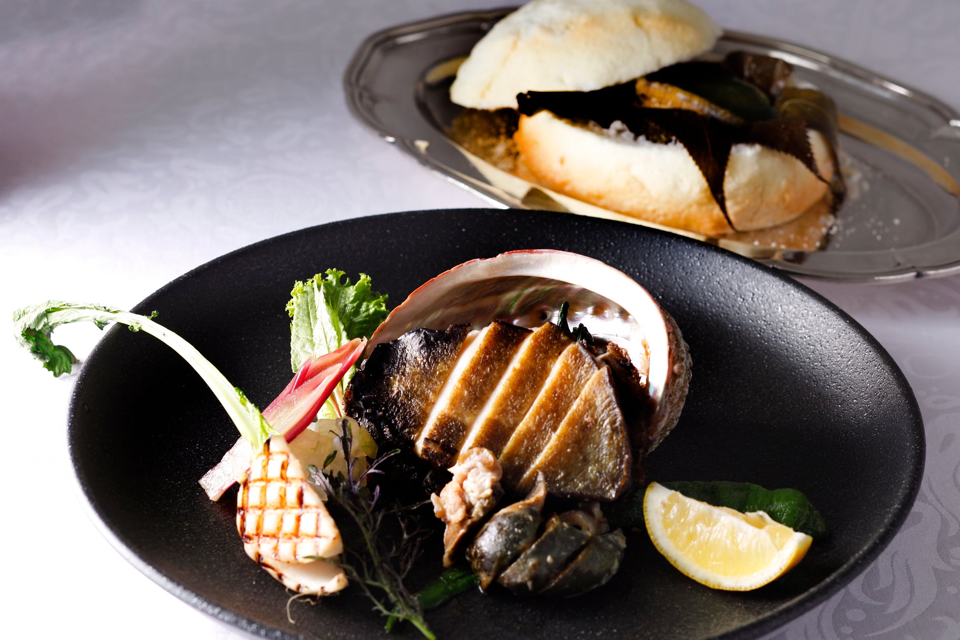 300g以上の国産黒アワビを桜の葉で包み香りをつけ、塩釜焼きで旨味をとじ込めました。