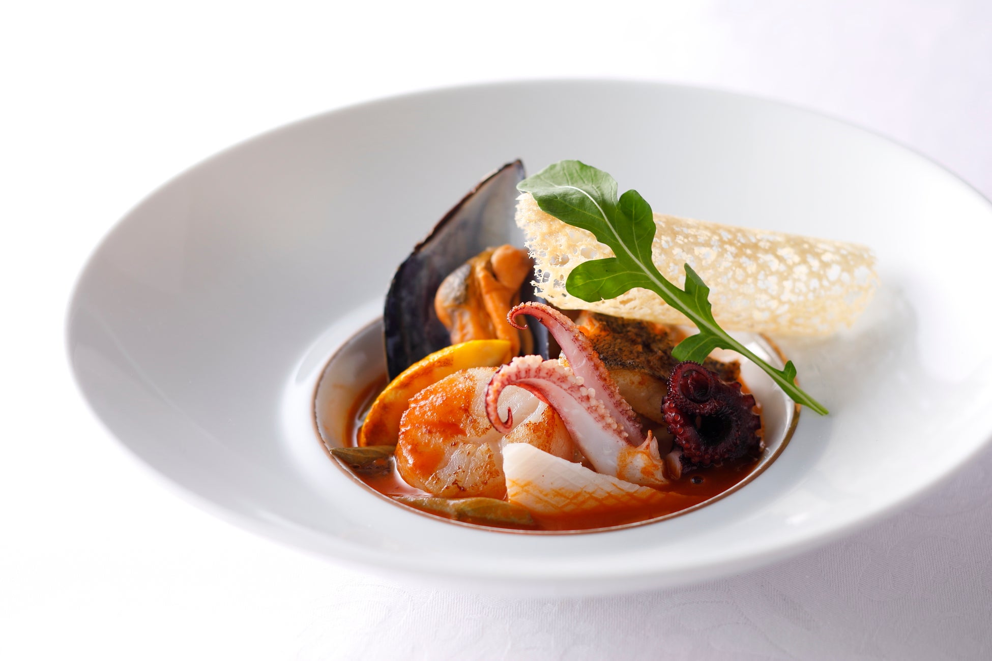 魚料理は、マゴチ、呼子イカ、帆立貝を主役にブイヤベースで仕立てました。秋田県三種町の清らかな水で育った、希少な生じゅんさいと一緒にお楽しみください。