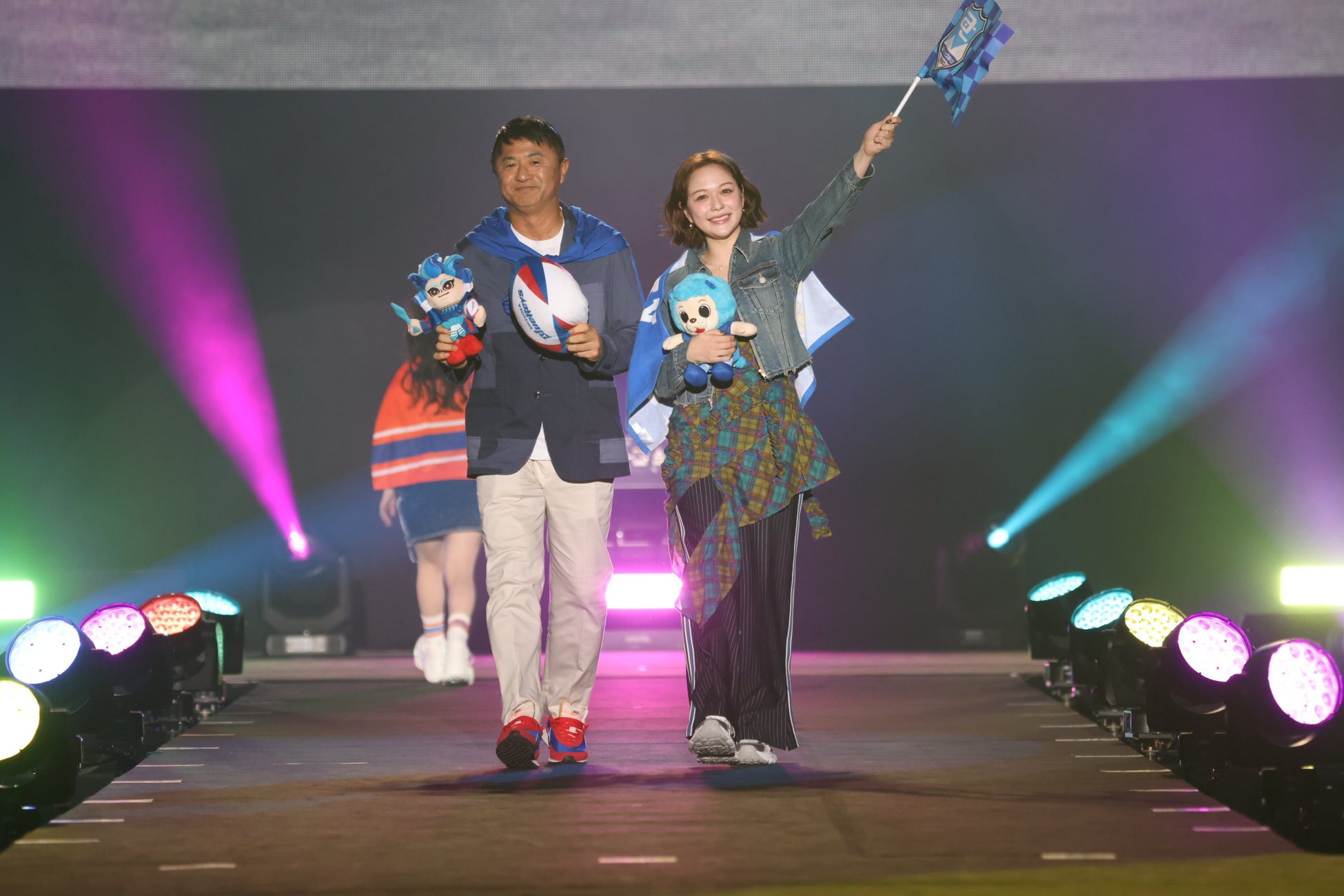 TGCしずおか共催の静岡県は、静岡県内に18ものプロスポーツチームがあることから、県内のプロスポーツチームのグッズを取り入れたファッションショーを展開。トップバッターに、静岡県生まれで、モデル・タレントとして国民的人気を誇るカリスマ池田美優が登場!続けて、身長186cmの抜群のスタイルで、モデルや俳優としても活躍する鈴々木響が、ジーンズジャケットにピンクのトップスとスウェットパンツを合わせたスポーツMIXなコーディネートで、ラストには、静岡県が生んだ日本サッカー界のレジェンドで、TGC初登場となった武田修宏と、バラエティ番組を中心に大活躍のタレント村重杏奈が(写真、左)、ラグビーチーム「静岡ブルーレヴズ」、サッカーチーム「アスルクラロ沼津」の応援グッズを取り入れたコーディネートで、ペアで登場しました。