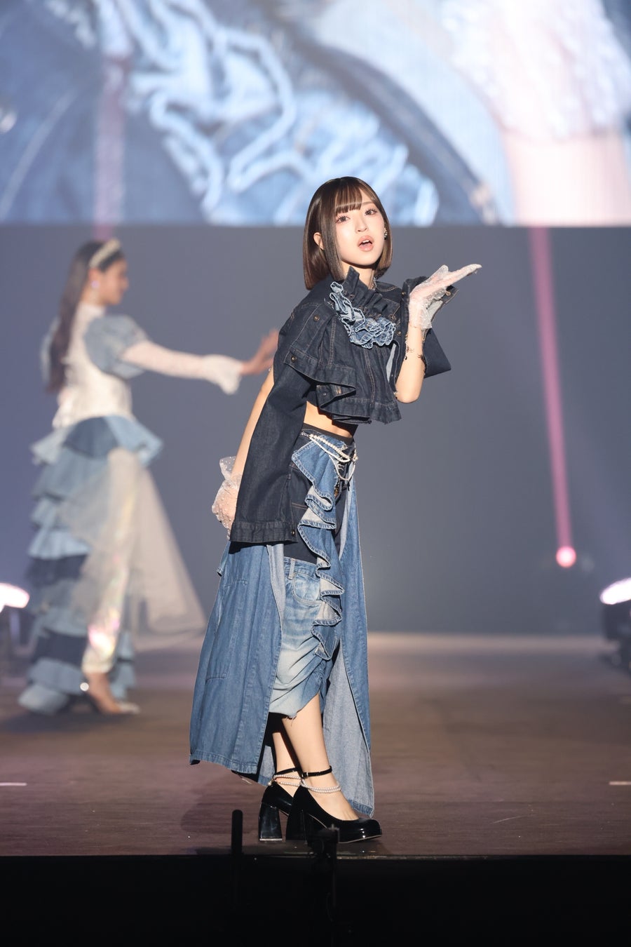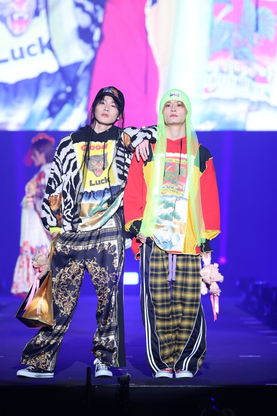 続けて、元Candystripperデザイナーの菊地千春が手がける、デザイナーの“好き♥”が凝縮された懐かしくて新しい「ハイパージャパンリメイクブランド」Mother's made(マザーズメイド)のステージには、「Crossover」をテーマに、カジュアルな洋服に日本伝統の着物の生地を一部組み込んだ華やかなリメイク衣装で、メインアーティストとしても登場したDXTEENから、大久保波留、寺尾香信がペアでサプライズ登場した他、矢吹奈子がオリジナルのヘッドピースが印象的なコーディネートで登場し、会場を盛り上げました。