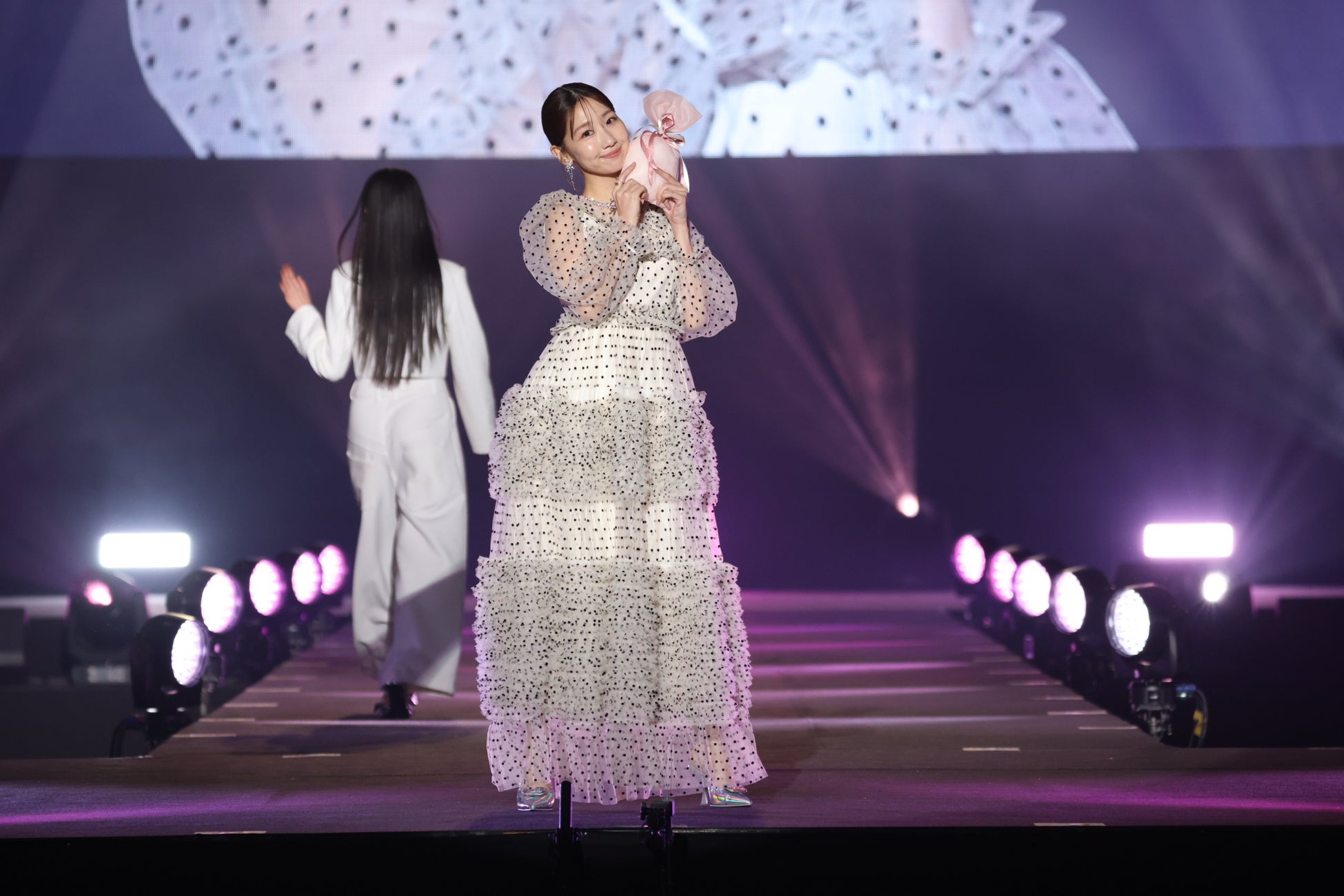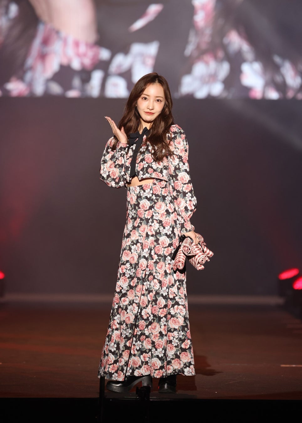 続けて、AKB48の1期生として国民的人気を博し、卒業後は、タレント、モデル、アーティストとしてマルチに活躍する板野友美がディレクターを務めるライフスタイルブランドで、“花々が輝く”という意味が込められたブランド名の通り、誰かと比べるのではなく、自分を愛し、たくさんのお水や肥料を与えて素敵なあなたを咲かせて欲しい。そして、女性がどんな時も前向きに一歩前進できる“きっかけ”を作りたいという想いが込められたプロダクトを展開しているRosy luce(ロージールーチェ)のステージには、トップバッターで、ディレクター板野友美自らが登場!村重杏奈はブランド名を象徴する花柄のワンピースで登場し、ランウェイを彩りました。