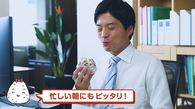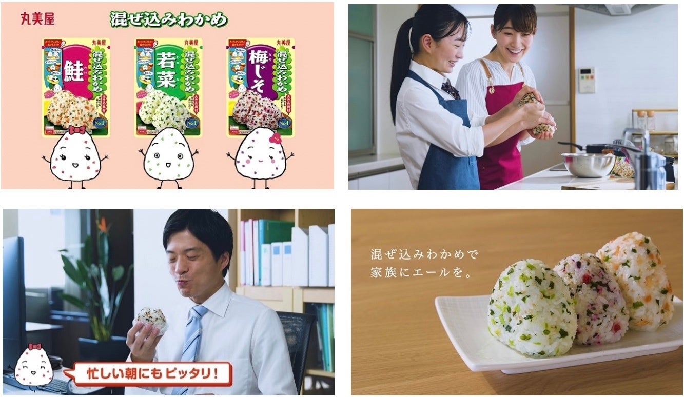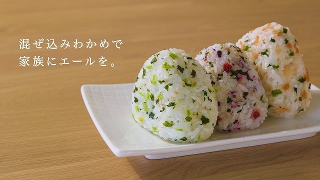 お母さんが娘のお弁当のために、娘がお父さんの朝ごはんのために、お父さんが家族の休日ごはんのためにおにぎりをにぎります。「混ぜ込みわかめ」で、今日も頑張る家族にエールを届ける内容となっています。