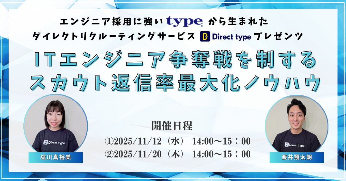 ダイレクトリクルーティングサービス「Direct type」では、11月12日(水)および11月20日(木)に「ITエンジニア争奪戦を制するスカウト返信率最大化ノウハウ」を開催いたします。