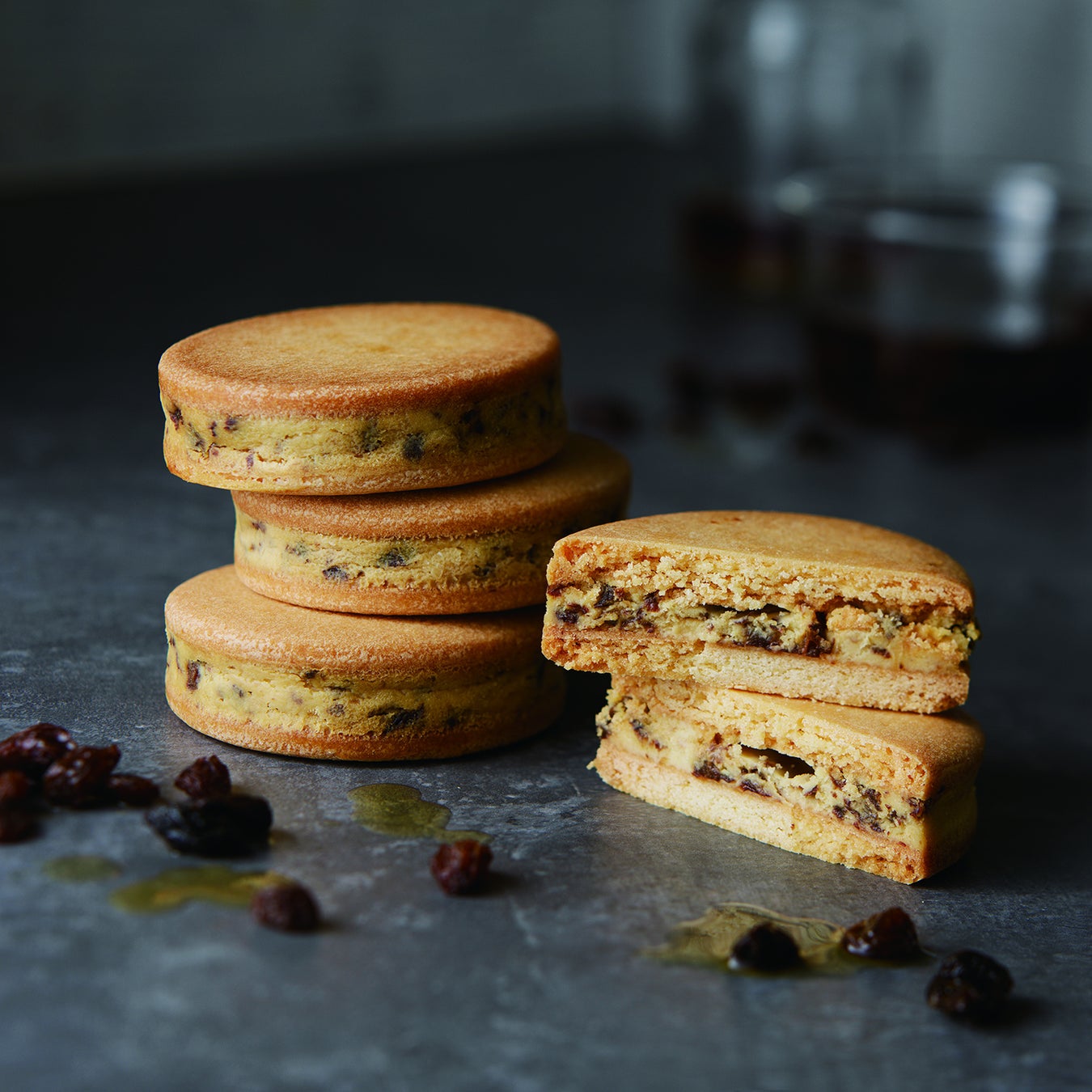 口どけの良いクリームチーズとマスカルポーネのベイクドチーズをブレンドし、厚めのサブレでサンドしました。ベイクドチーズにはラムレーズンを合わせ、芳香なレーズンの甘みがチーズのコクと相性良く口に広がります。