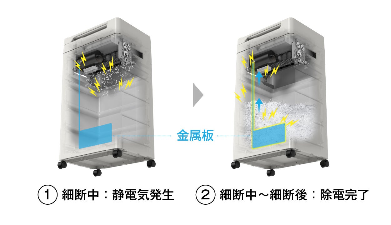 今回発売する「オートフィードシュレッダー28L/37L」は、細断中に発生する静電気を抑制・除去できる「除電クリーンシステム™」を搭載しています。当システムは細断くずに溜まった電子をダストボックスから細断機構へ流すことで電子の偏りを均一化し、静電気を抑制・除去する当社独自の技術を採用しています。これにより、ダストボックスの帯電量を従来品に比べ約90%抑制し(※1)、細断くずの散乱を最小限に防ぐことで、ごみ捨て時の片付けの手間を軽減できます。