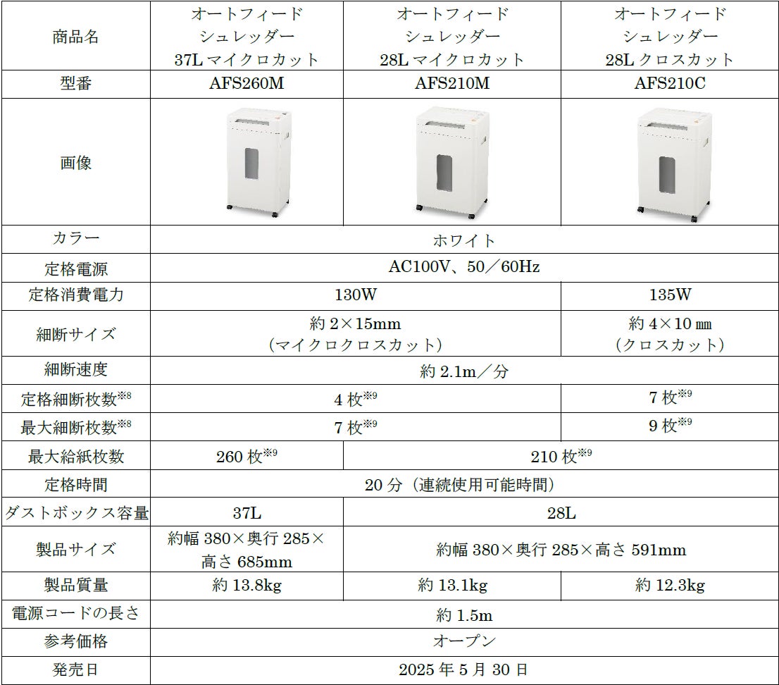 ※2:「オートフィードシュレッダー 28Lマイクロカット・28Lクロスカット(AFS210)/37Lマイクロカット(AFS260)」