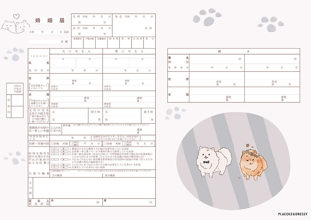 今回の新作は、ご当地シリーズ2種類、動物シリーズ1種類、趣味シリーズ1種類の全4種類のデザインです。さらに印刷の仕方がわからない方、高品質で印刷したい方向けに購入サイトにもデザイン追加。以下よりチェックしてみてくださいね。10月の新デザインも、多くのカップルにとって特別な1枚となること間違いなしです。ぜひ『PLACOLE&DRESSY婚姻届』をダウンロードして、お二人にぴったりのデザインを見つけてください。