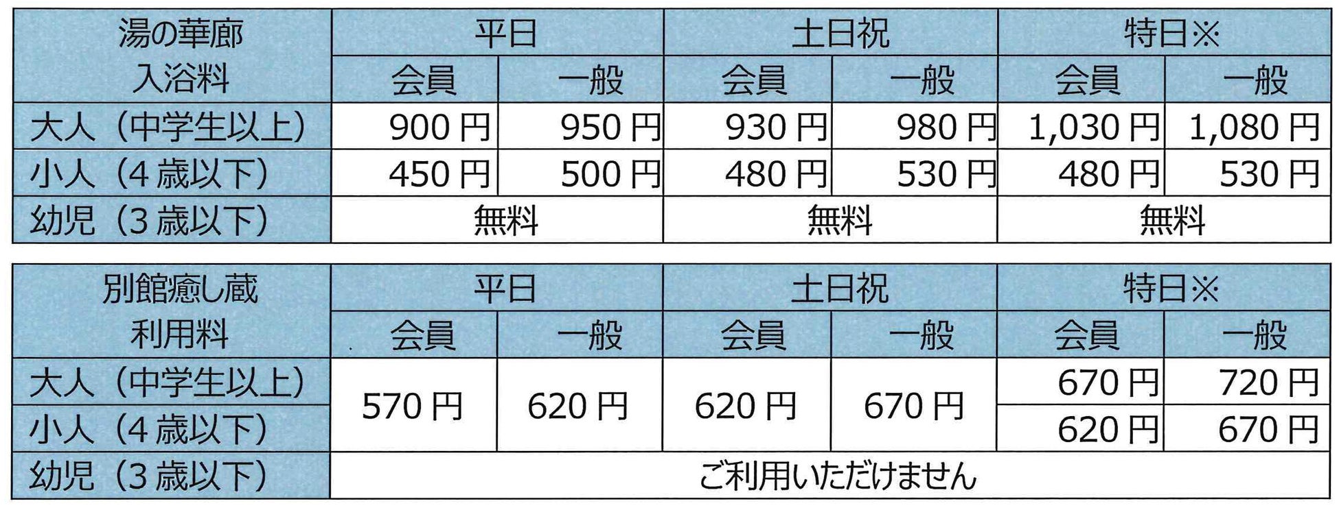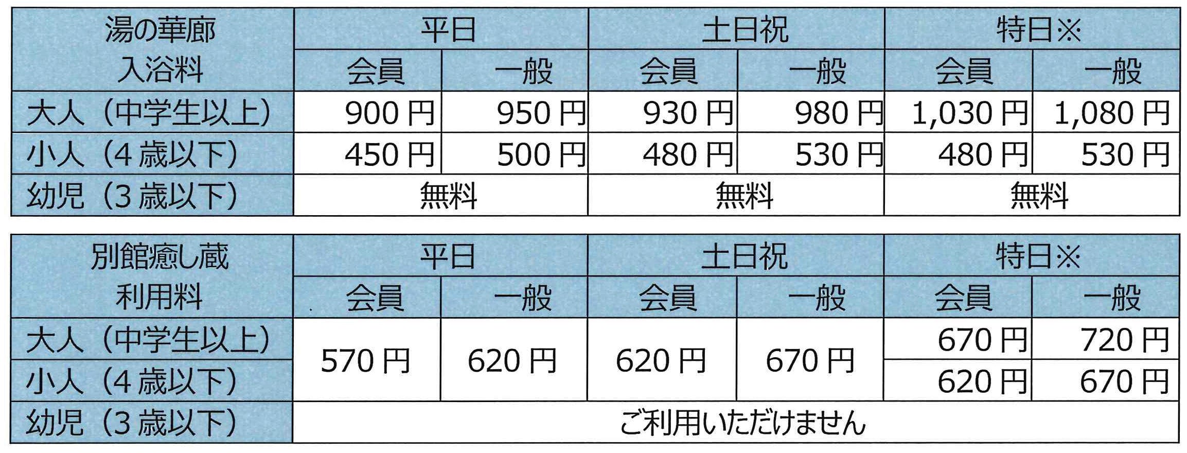 【平日限定】第2弾:春のお得な入館キャンペーン 当日大人入浴+別館癒し蔵がお得な料金で利用できます。 (1)会員:1,200円(税込) (2)一般:1,300円(税込) |