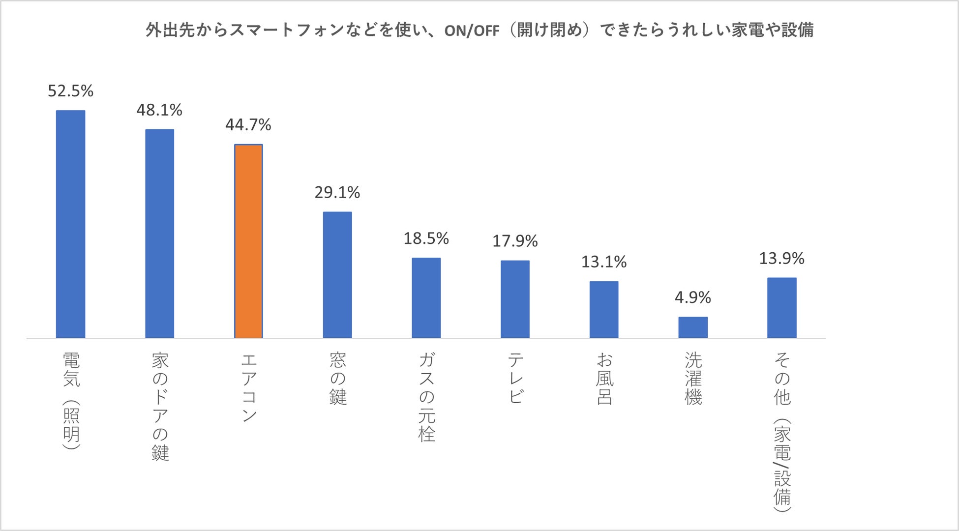 また、外出先からスマートフォンなどを使って操作したい家電や設備では、「電気(照明)」「家のドアの鍵」「エアコン」が上位に上がりました。