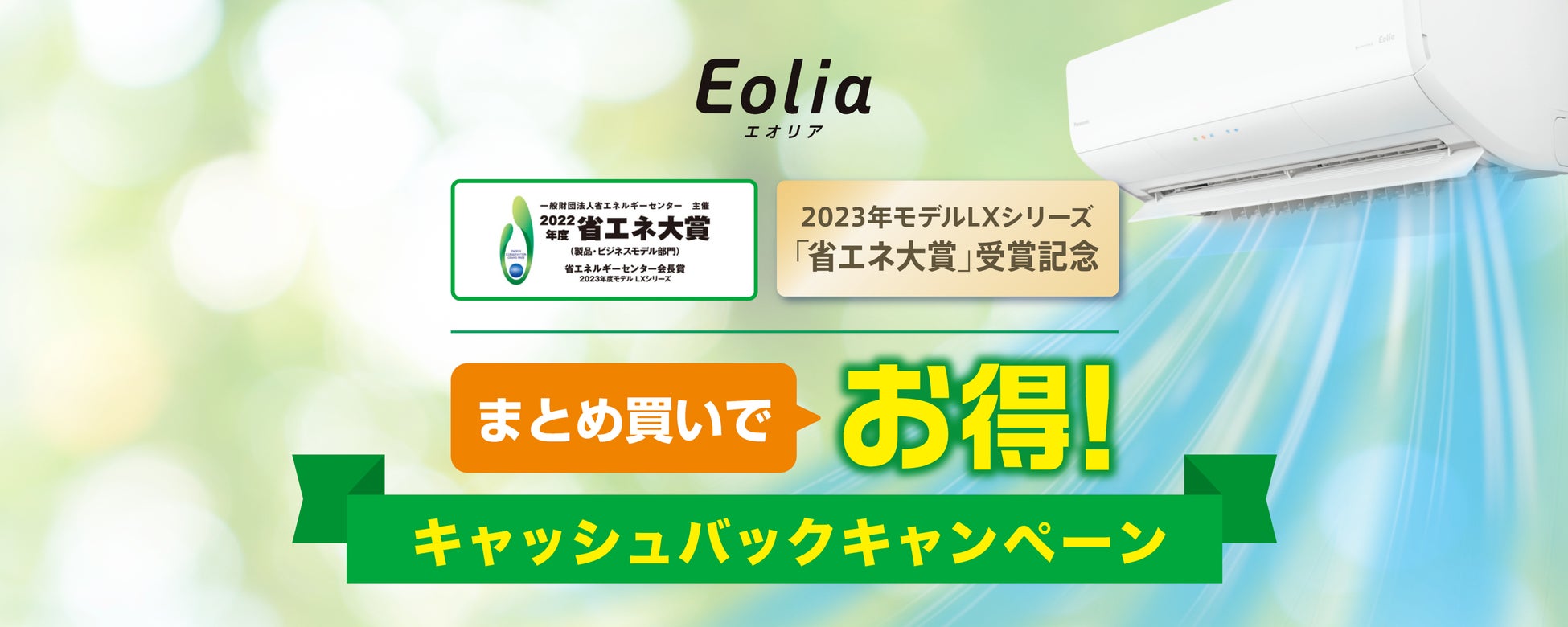 2023年モデル LXシリーズの「省エネ大賞」受賞を記念して、「エアコンまとめ買いでお得!キャッシュバックキャンペーン」を実施します。