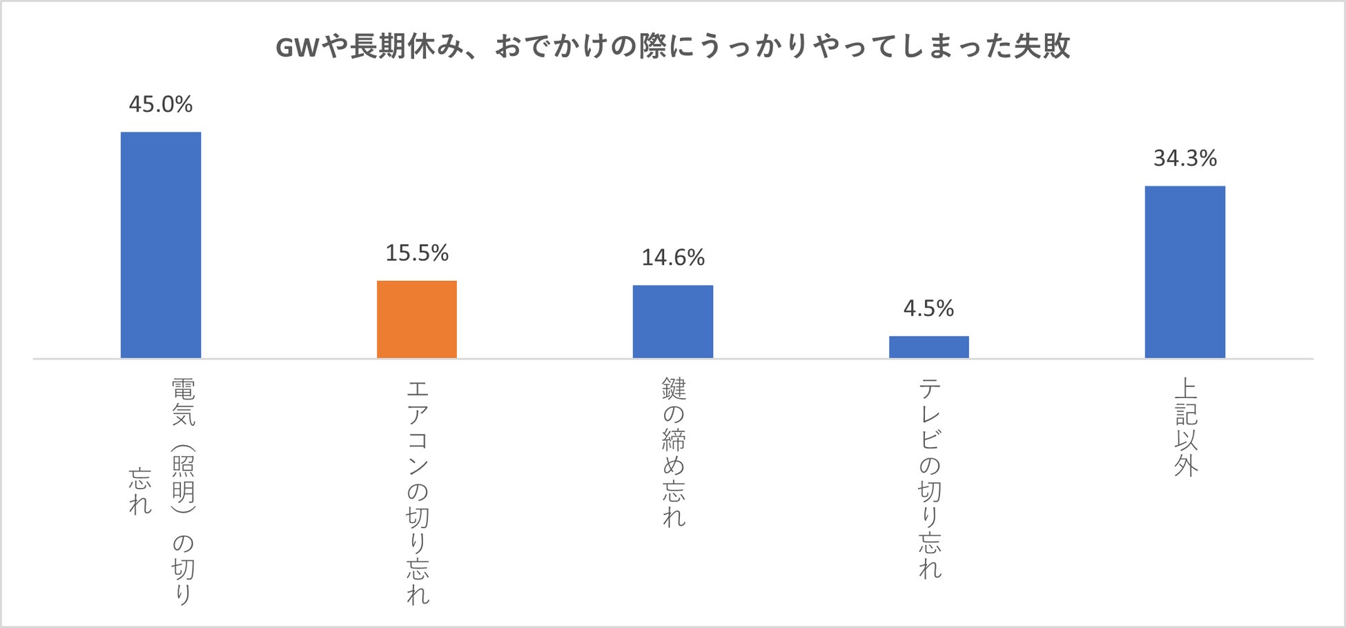 /おでかけの際のついうっかりやってしまった失敗経験」を調査しました。調査の結果、うっかりやってしまった失敗経験の第1位は「電気(照明)の切り忘れ 45%」、第2位は「エアコンの切り忘れ 15.5%」で、家電製品の電源の切り忘れが上位になりました。「すぐ帰るつもりででかけたら入院になり、窓が開いてるしエアコンがついてるのがわかっていたけど1週間何もできなかった(30代 愛知県 女性)」や、「外が明るくなっていたので電気がついているのに気づかなかった(70代 大阪府 女性)」などの声がありました。