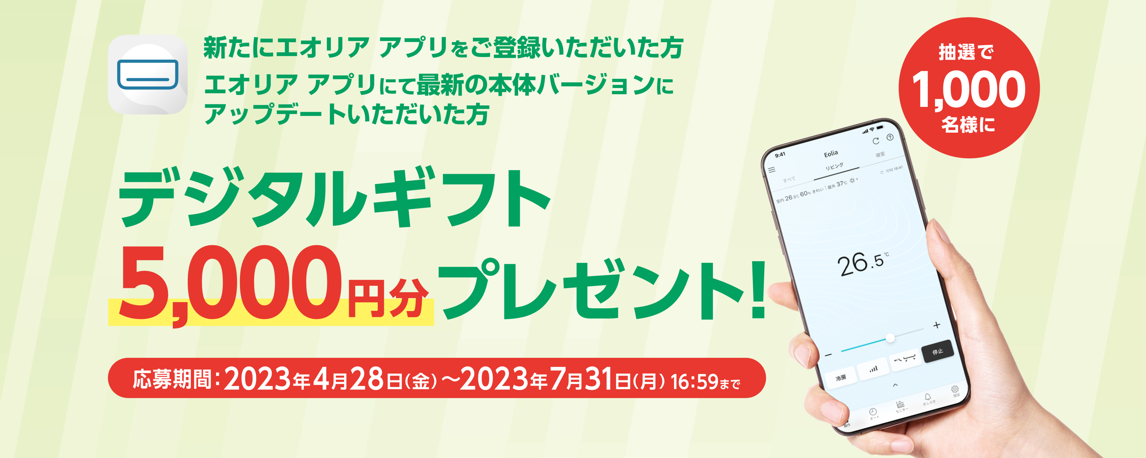 エオリア アプリで最新バージョンをご使用いただいた方の中から抽選で1,000名様に、「デジタルギフト5,000円分」をプレゼントします。
