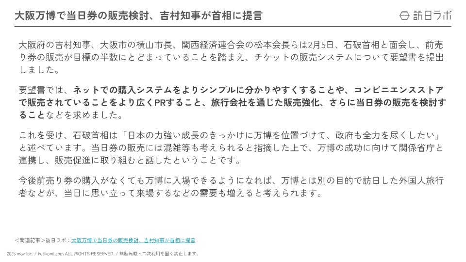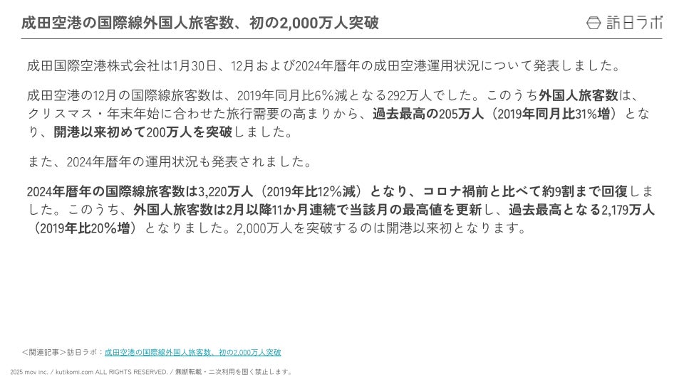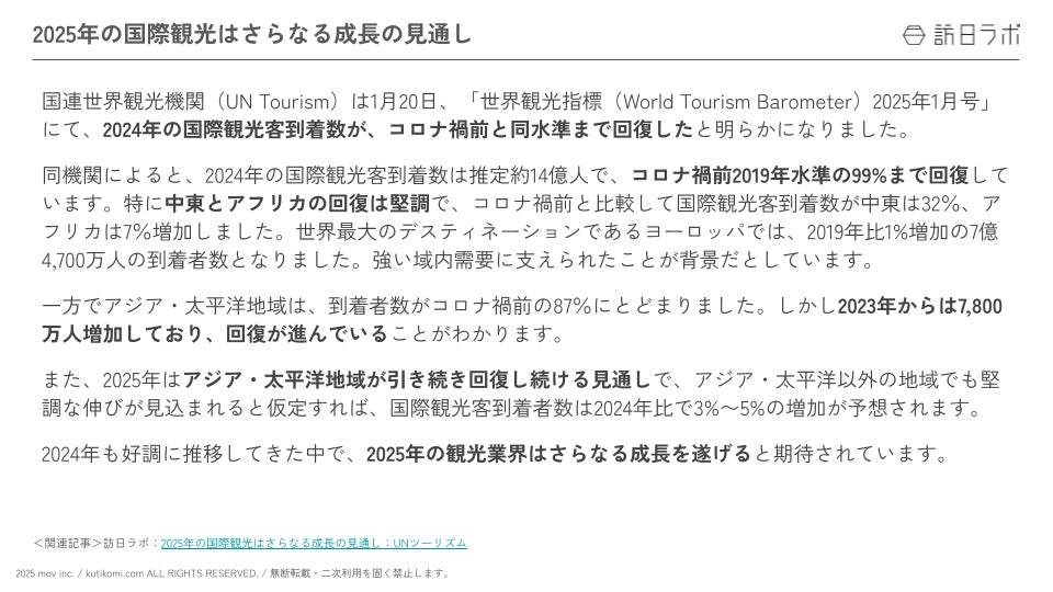 業界最大級のインバウンドビジネスメディア「訪日ラボ」及び 店舗向け集客一元化プラットフォーム「口コミコム」を運営する株式会社mov(代表取締役:渡邊 誠、本社:東京都渋谷区、以下mov)は、「インバウンドに関する最新トレンド・データ」「政府・自治体・企業などのインバウンド関連の取り組み」をはじめ、インバウンド対策に役立つニュースをまとめた「インバウンド情報まとめ【2025年2月前編】」を公開しました。