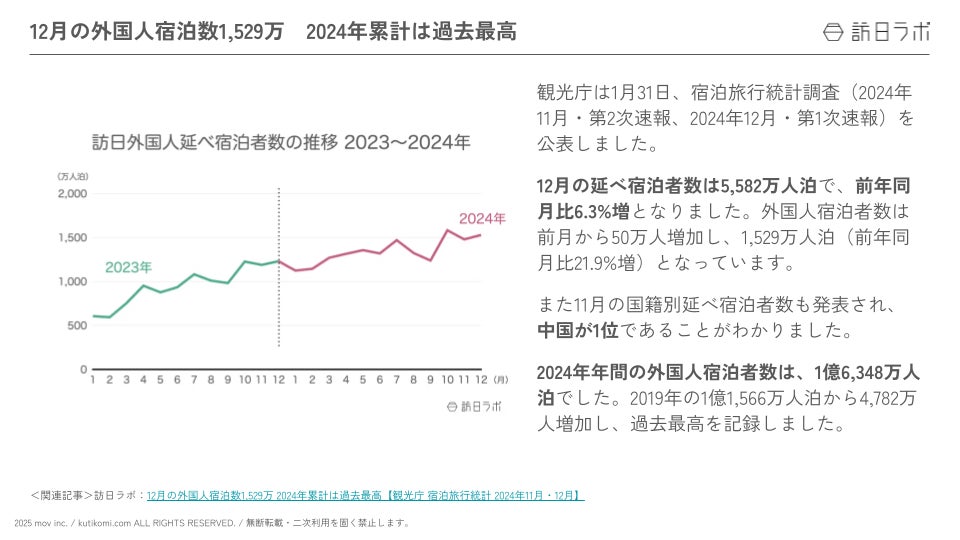 12月の外国人宿泊数1,529万人、2024年累計は過去最高:観光・インバウンドの最新動向がわかる!インバウンド情報まとめ「2025年2月前編」を訪日ラボが公開