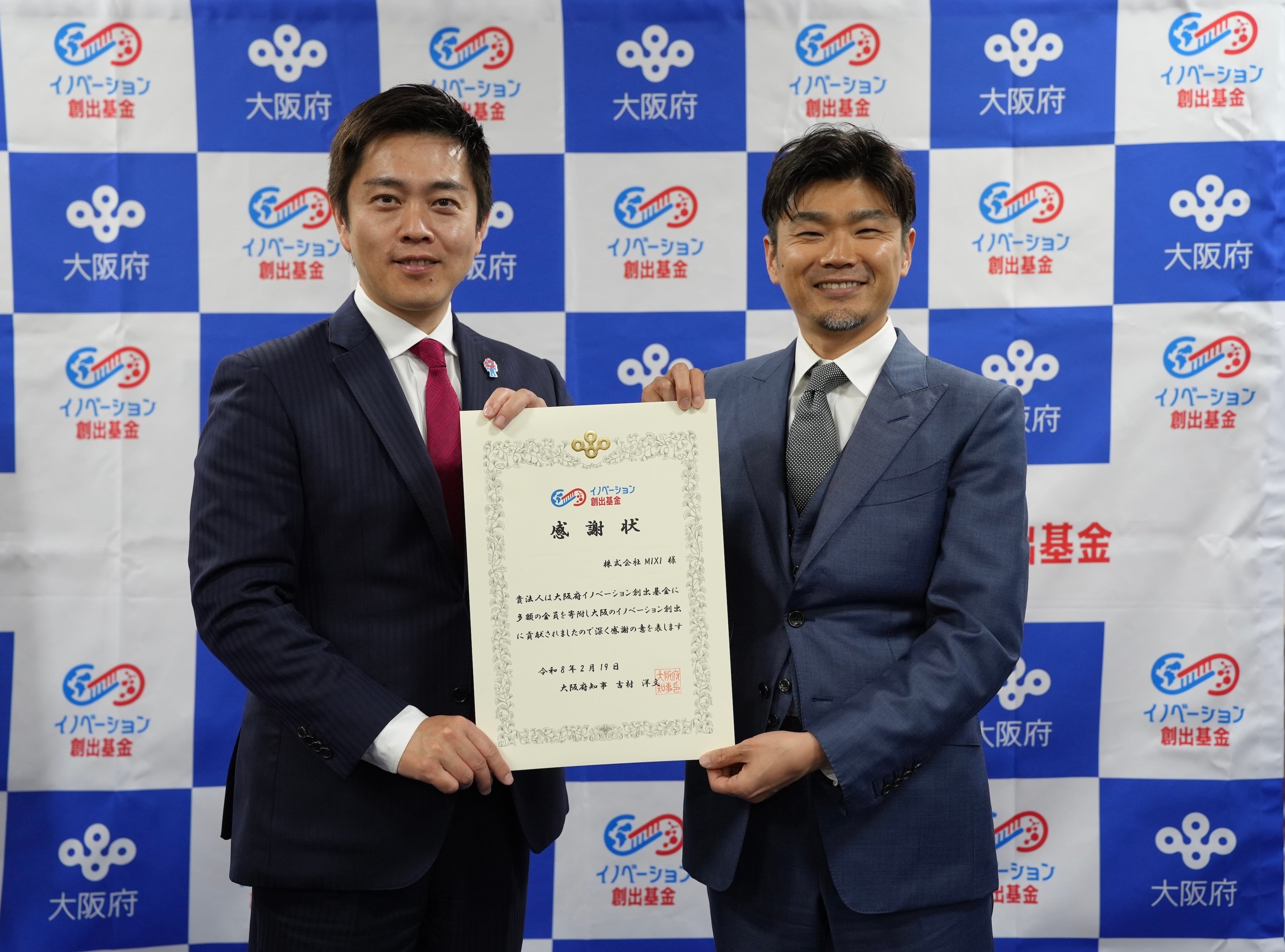 株式会社MIXI(東京都渋谷区、代表取締役社長 上級執行役員 CEO:木村 弘毅)は、大阪府に対して2025年に行った「大阪府イノベーション創出基金」への寄附について、このたび感謝状を受領しました。