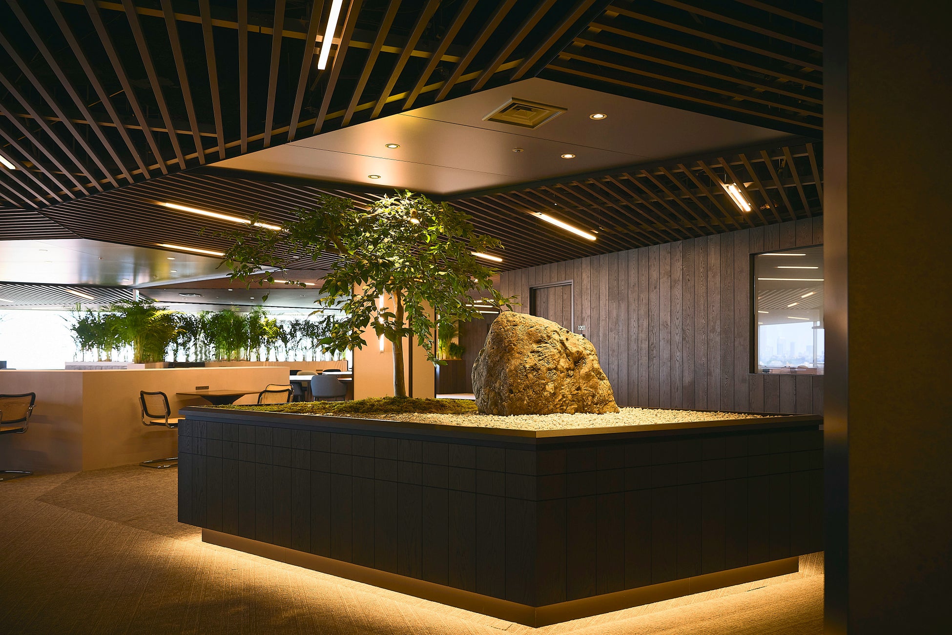 日常的なオフィスにおいて、四季の変化を届けたいという思いのもと、“現代のプラントハンター”として、国内外の政府機関や企業、王族貴族など、様々なプロジェクトで植物を届けている西畠清順氏が手がけた、『双対の庭』がオフィスを訪れる人々をお迎えいたします。