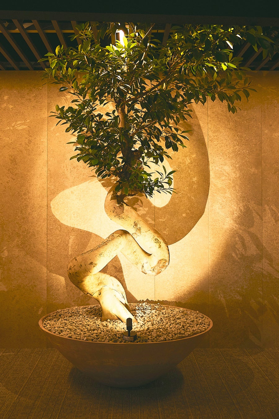 驚異的な生命力を宿し、豊かな葉と絡み合う根が力強さを感じさせる、高さ約3mの巨大な「ガジュマル」をエントランスに配置。健康や多幸といった花言葉をもち、“幸せを呼ぶ木”として広く親しまれており、空間に心地よい調和をもたらしながら、訪れる人々を穏やかに迎え入れます。