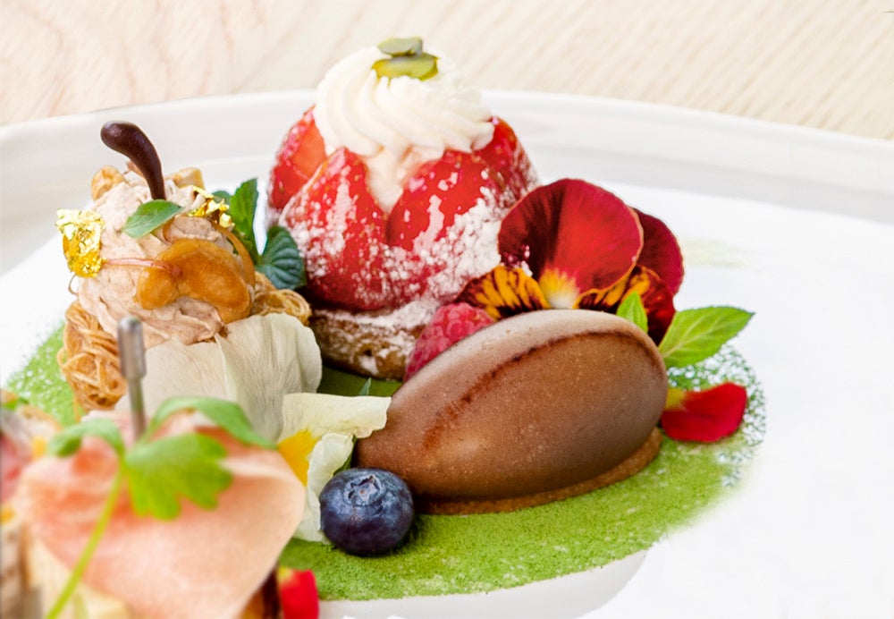 デザート…森の焼きりんごパイ、ウリ坊モンブラン、クレームマスカルポーネシトロン、タルトフレーズ、カダイフシュー、焼き菓子、ボンボンショコラのいろいろ、アイスクリームまたはソルベ