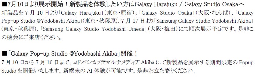「Samsung Galaxy Z Fold7」(SIMフリーモデル)はSamsungオンラインショップ(https://www.samsung.com/jp/offer/)、Galaxyブランドショーケース「Galaxy Harajuku」(東京・原宿)、「Galaxy Studio Osaka」(大阪・なんば)にて2025年7月17日(木)より予約受付を開始し、8月1日(金)より販売を開始いたします。実機は明日7月10日(木)より「Galaxy Harajuku」、「Galaxy Studio Osaka」、「Galaxy Pop-up Studio @Yodobashi Akiba」(東京・秋葉原)にて展示開始予定です。