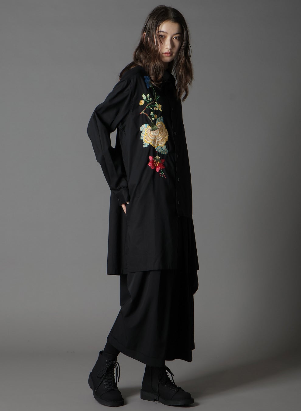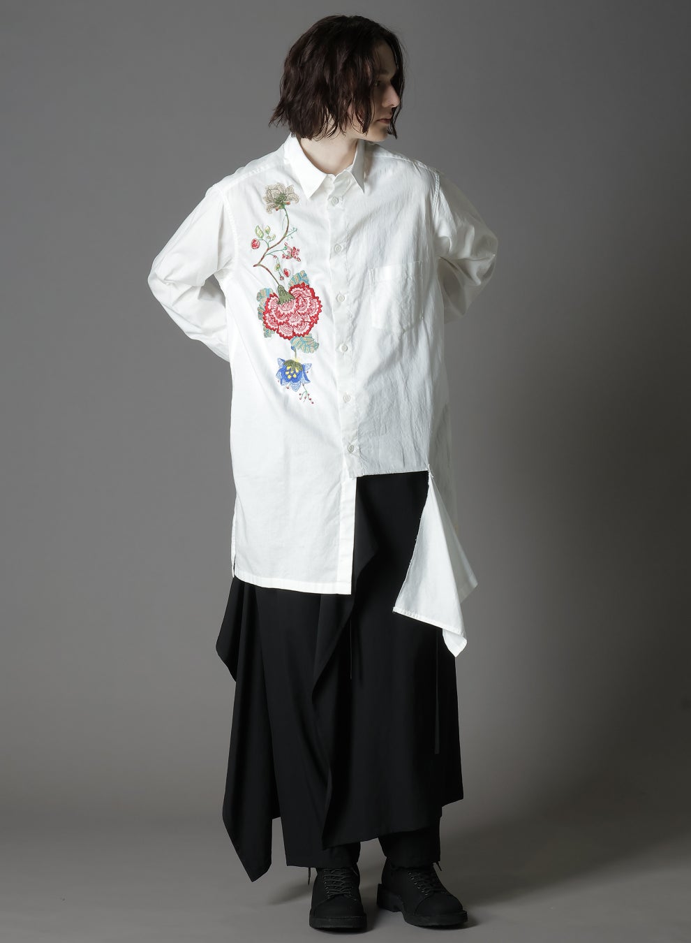 右胸に鮮やかな中華花の刺繍、左裾に大胆な切り込みが施されたシャツは、アシンメトリーなデザインが特徴で華やかさとエレガントさを演出します。白と黒の2色展開、フリーサイズでリラックス感を与え、コットン100%の素材がさまざまなシーンで幅広く活躍します。