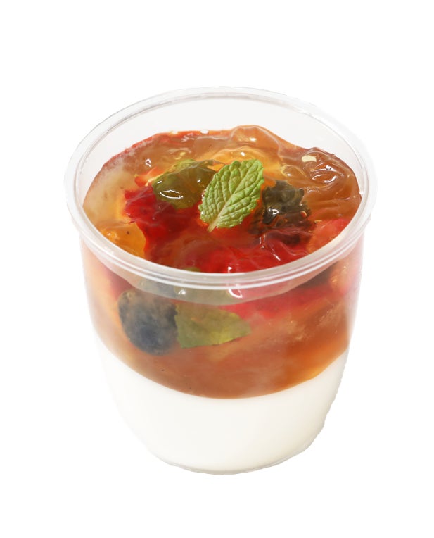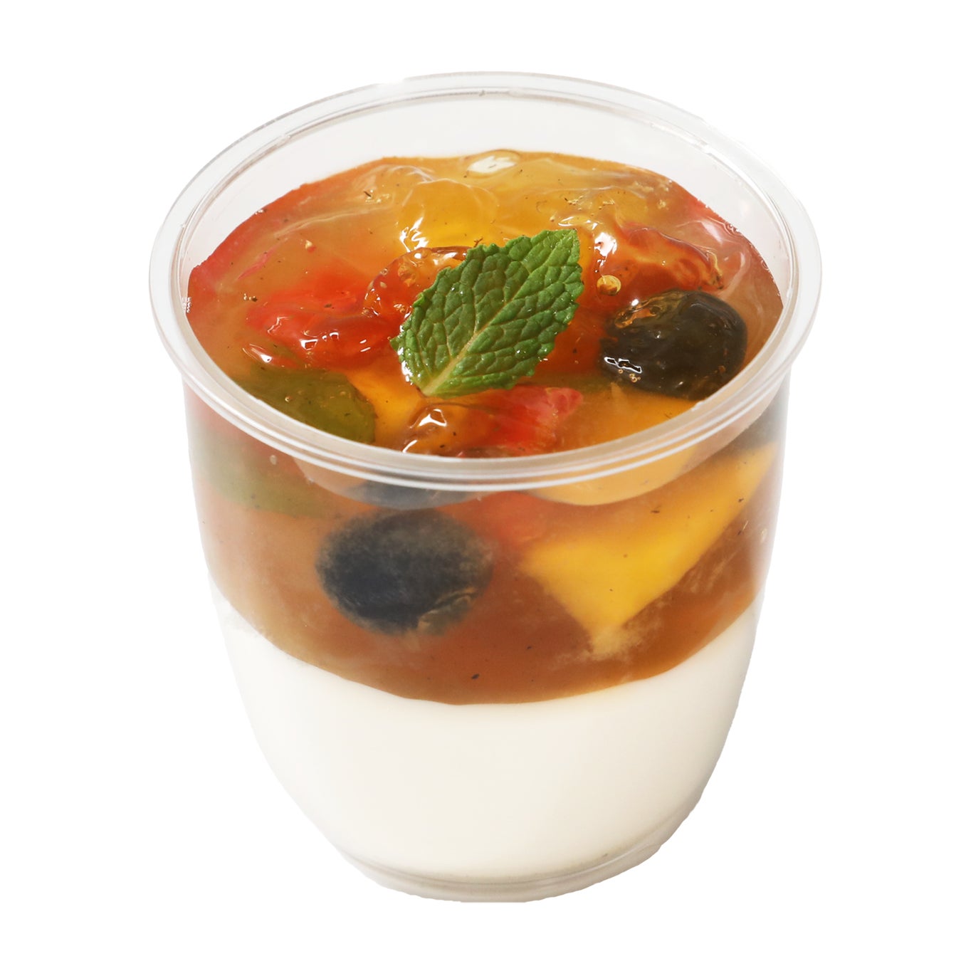茉莉花(ジャスミン)茶で香り付けをしたなめらかな豆乳プリンの上に、香り高く煮出した茉莉花茶のゼリーと色鮮やかなフルーツ(マンゴー・ブルーベリー・フランボワーズ)を入れて仕上げました。