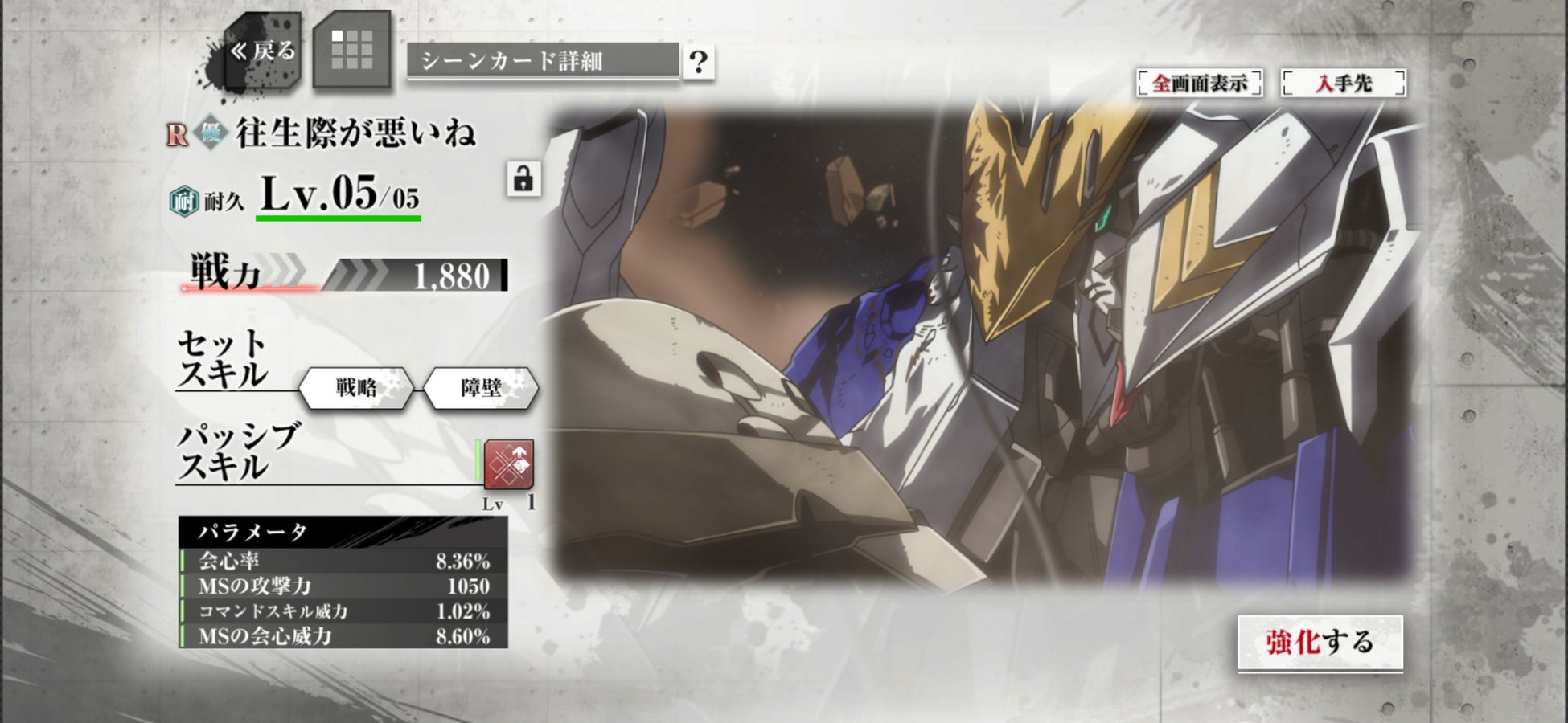 所持しているMSやパイロットを自由に組み合わせて出撃できることはもちろん、「鉄オルG」では、パイロットに「シーンカード」を装備することができます。