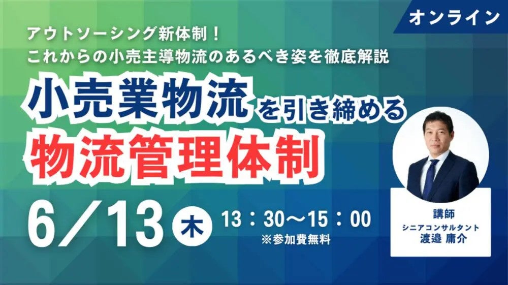 日本最大級の物流コンサルティングファーム 船井総研ロジ株式会社(本社:大阪市中央区、代表:橋本直行、以下「船井総研ロジ」)は、2024年6月13日(木)13:30~15:00、小売業の物流施策検討者、小売業物流部課長職以上、物流子会社(役職者)を対象にしたセミナー「アウトソーシング新体制!これからの小売主導物流 あるべき姿~これからの小売業物流を引き締める物流管理体制~」をオンラインで開催いたします。