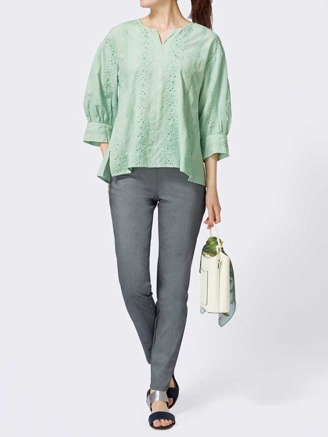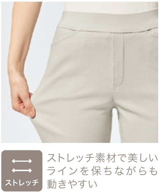 N+では、35歳~54歳までの女性350人以上の体形データを3D分析し、体形の変化を考慮した美しいシルエットを叶えるパンツを開発しました。ウエストは曲線的な女性の体のラインにフィットするアーチ型のゴムベルト仕様で、圧迫感のないサポート性とすっきりとしたウエスト周りを実現します。ストレッチ素材で、美しいラインを保ちながらも動きやすいパンツシリーズです。