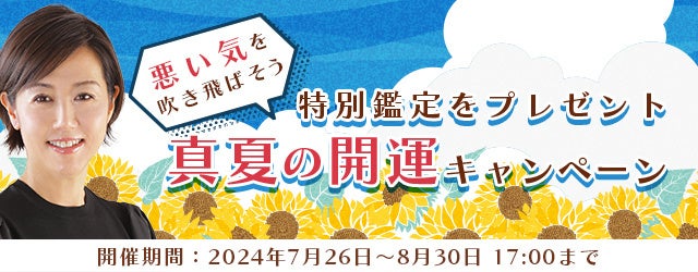 TV番組『突然ですが占ってもいいですか?』出演で話題の占い師・村野弘味の公式占いサイト「村野弘味の九星気学」では、「真夏の開運キャンペーン」を開催中です。期間中は、対象の鑑定を占っていただいた方全員に、期間限定の特別鑑定をプレゼントいたします。蒸し暑い日本の夏。気の滞りも生まれやすい時期です。モヤモヤした気分を晴らし、スカッと運気アップにつなげていきましょう!皆様が、希望溢れる爽やかな風を感じられますよう願っております。