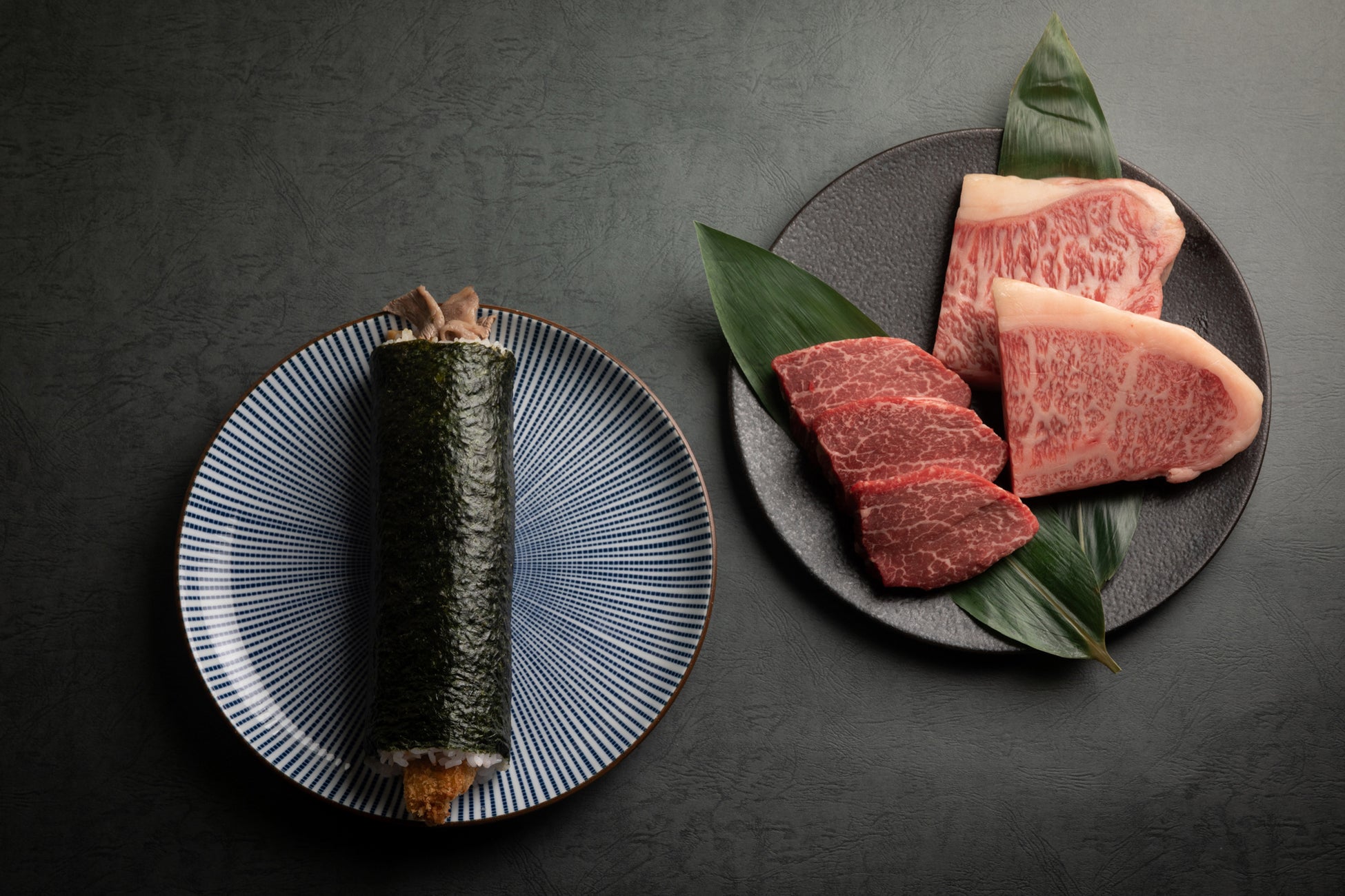 国産牛のフィレカツは、西京味噌で和風に仕立て、京都産黒豆を炊き込んだ薄紅色のシャリで包み、壬生菜の香りと食感がアクセントとなる一品、国産牛ロースは京都産筍と甘辛く炊き合わせ、実山椒がピリッと効いた一品です。酢飯には京都の老舗「村山造酢」の千鳥酢を使用し、味わいと見た目にこだわった贅沢な仕上がりです。