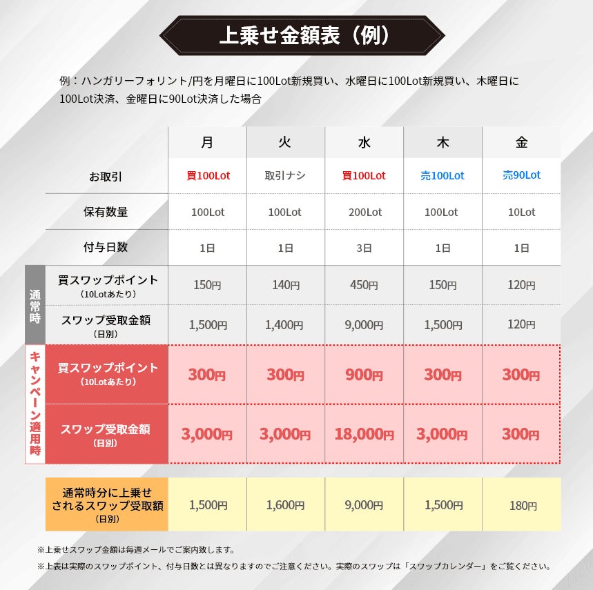 ・キャンペーン開始前に買付けたポジションに対しては、上乗せスワップが適用されません。