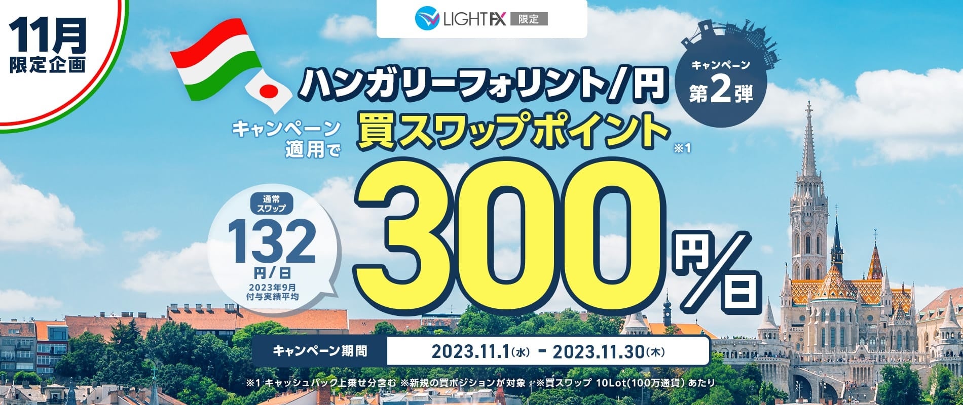キャンペーン内容は前回と変わらず、開催期間中に「LIGHT FX」におけるハンガリーフォリント/円の買スワップ金額が1日あたり300円(10Lot)になるよう、通常のスワップ金額に上乗せしてご提供するものとなります。
