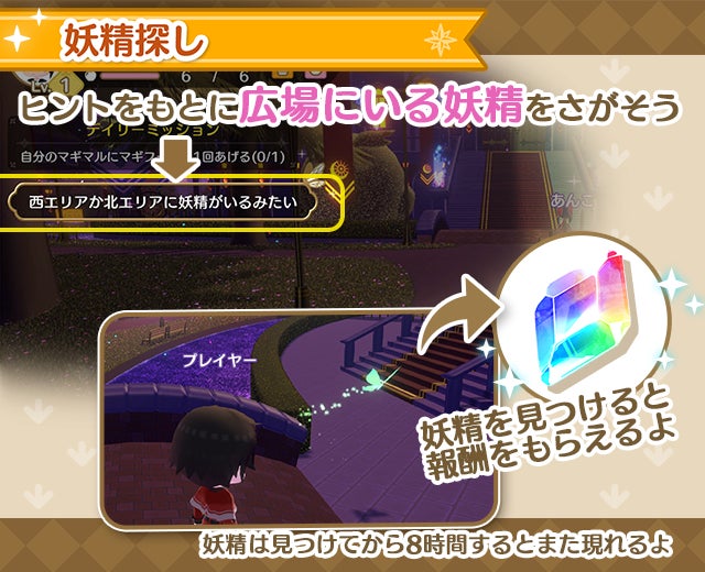 画面に表示されるヒントを元に、広場に出現する妖精を探しに行きましょう。妖精を見つけると報酬がもらえます。妖精は見つけてから8時間経過すると、再びどこかに出現するのでヒントを頼りに探してみてください。