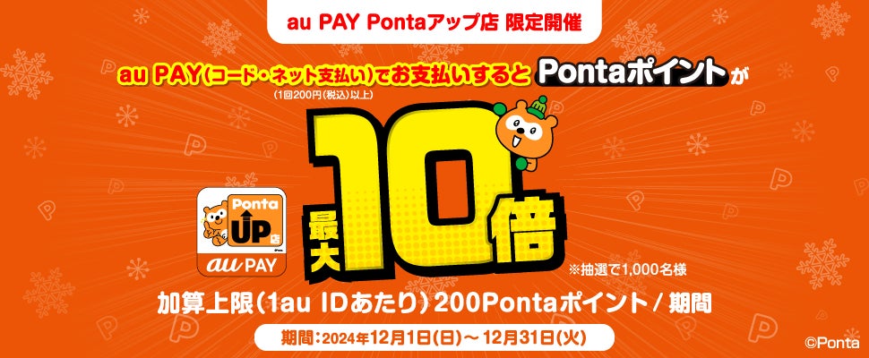 また、2024年12月1日から12月31日まで、新規加盟店を含む全ての「au PAY Pontaアップ店」で、抽選で1,000名さまにPontaポイントが通常0.5%(1ポイント/200円)の最大10倍あたるキャンペーンを開催します。