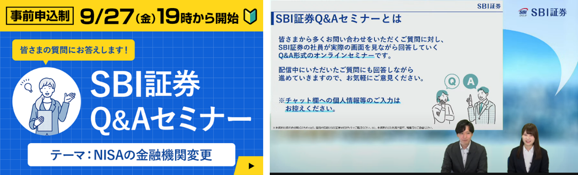 お客さまに事前にいただいた質問やチャットでリアルタイムでいただく質問に答える「Q&Aセミナー」を2024年9月27日(金)19時より開催します。お客さまから日々お問合せいただくことが多い質問を取り上げ、当社社員が生放送で回答します。過去には「NISAでの積立方法」や「証券口座の入金方法」などをテーマに開催しています。今回、実際の手続き画面を使ったQ&Aセミナーを開催し、NISA口座を他社から当社へ乗り換えるメリット、クレカ決済のポイントサービスや投資信託の保有で貯まる投信マイレージ等、 “NISAやるならSBI証券”の理由もお伝えします。
