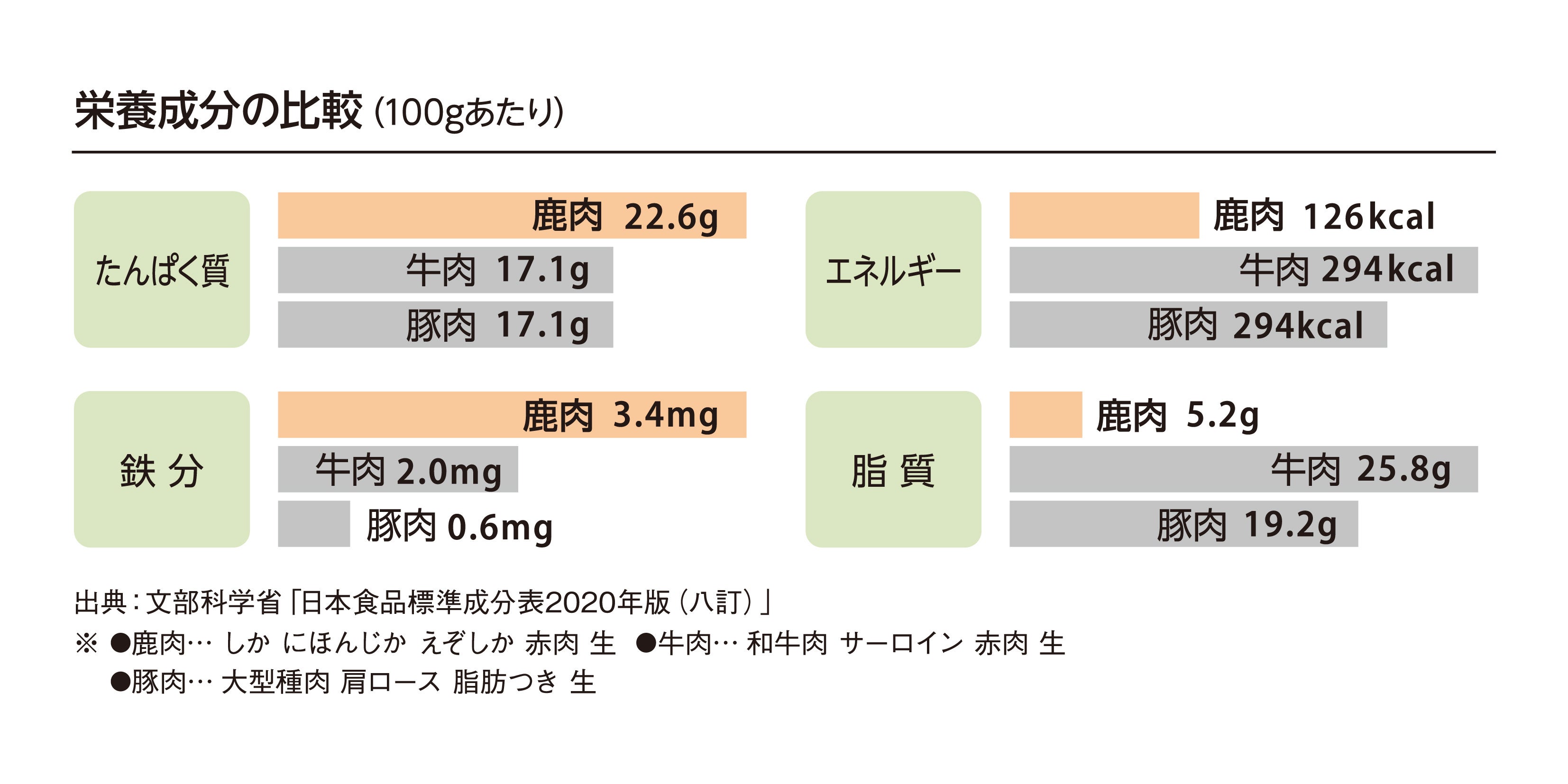 鹿肉は、牛肉や豚肉と比べて、高たんぱく質(22.6g/100g)で低カロリー(126kcal/100g)。また栄養成分として鉄分が豊富(3.4mg/100g)に含まれる※3ヘルシーな食材です。