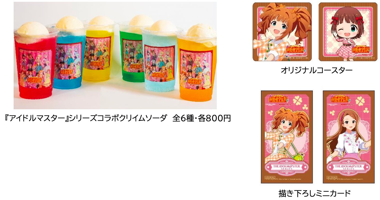『アイドルマスター』シリーズの各ブランドカラーをイメージしたクリイムソーダ『アイドルマスター』シリーズコラボクリイムソーダが登場。各ブランドのメニューを注文するとそのブランドに登場するアイドルをデザインしたコースター7種の中から1つ※1、さらにコラボフードは描き下ろしミニカードを1枚プレゼント!