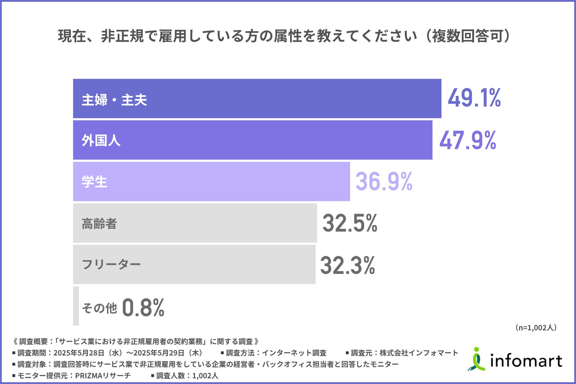 サービス業で非正規雇用をしている企業の経営者・バックオフィス担当者を対象に、現在非正規で雇用している方の属性を聞いたところ(n=1,002)、非正規で雇用される人材は、主婦・外国人・学生等の属性が幅広いことが分かりました。こうした多様性は現場の柔軟な運営を可能にする一方、契約業務の複雑化を招いています。