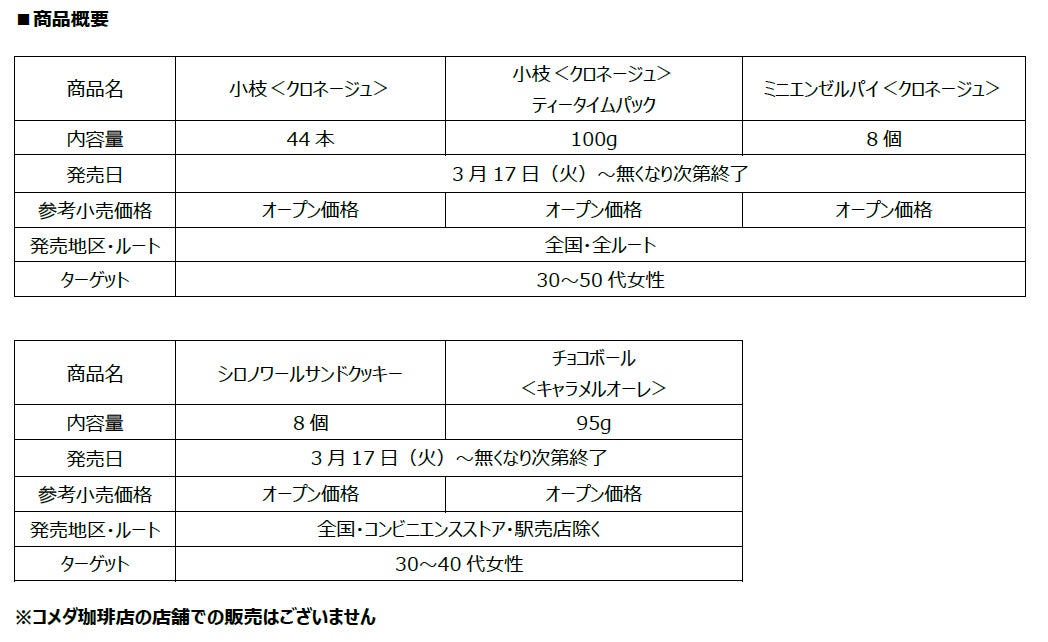 ココアビスケットクランチが心地よい「小枝<クロネージュ>」、ふわもちマシュマロが特長の「ミニエンゼルパイ<クロネージュ>」、ふんわりとメープルが香る「シロノワールサンドクッキー」、そしてコメダ珈琲店店舗では味わえないコラボレーション限定の“幻の味”「キャラメルオーレ」をイメージした「チョコボール<キャラメルオーレ>」まで、コメダ珈琲店のメニューとの食べ比べや、家族・友人とシェアしても楽しい商品です。
