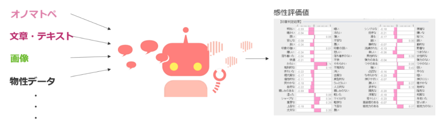 人は、感性(=様々なモノ・コトを見る / 触る / 味わうなどして五感で知覚し感じる能力)で感じとったモノ・コトの印象(質感、味わい、など)を、言語の情報(例:「さらさら」「とろり」などの擬音語・擬態語=オノマトペ)で表現します。感性AI株式会社では、この人の感性に結びつく様々な言語をはじめ、文章や画像などあらゆる情報の感性情報を人工知能(AI)により定量化する「感性評価AI”Hapina”」をコア技術としています。