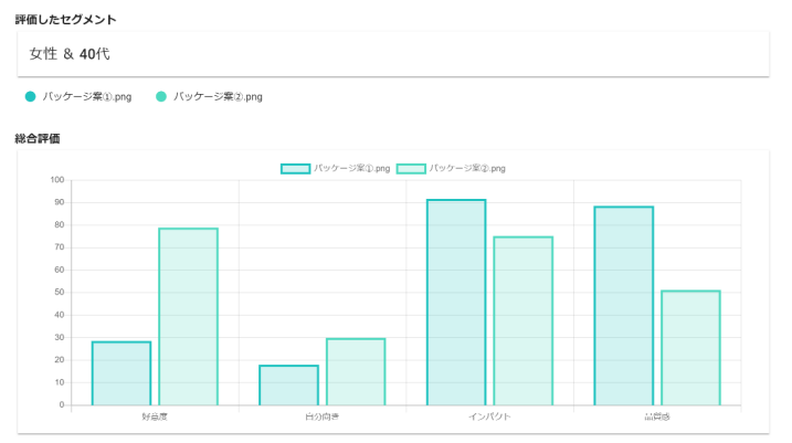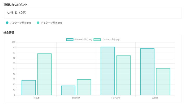 キャッチコピー・パッケージ分析について、「共感性」「品質感」「インパクト」の評価が新たに可能となります。これにより、性別・年代ごとに「好意度」「共感性」「品質感」「インパクト」の4評価及び43の感性尺度の数値化が可能になります。