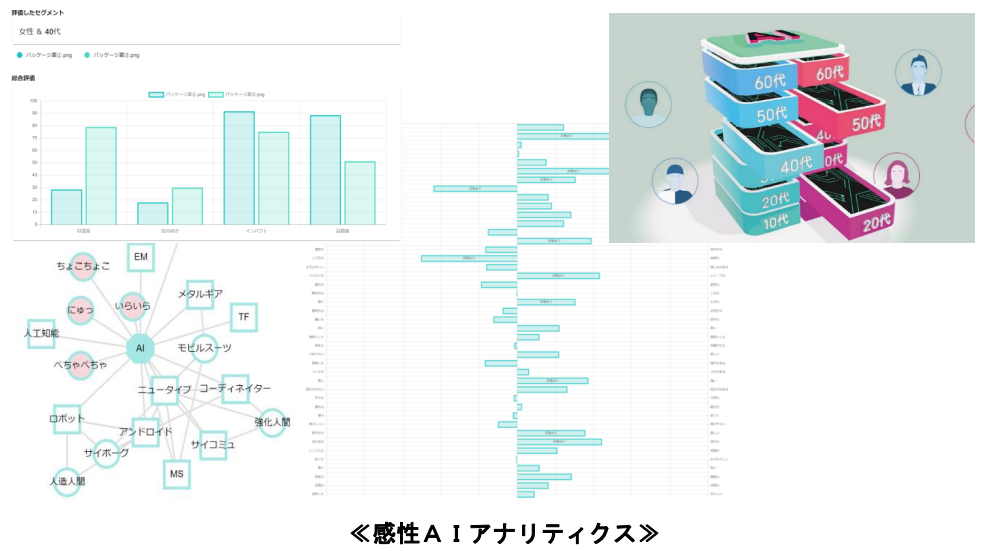 マーケティングソリューション「感性AIアナリティクス」は、消費者データを学習したAIが、ネーミング、キャッチコピー、パッケージの印象を瞬時に数値化・分析するイメージ分析AIツールです。新商品開発、既存商品リニューアル時のネーミングテスト、キャッチコピーテスト、パッケージデザインのテストにご活用頂けます。
