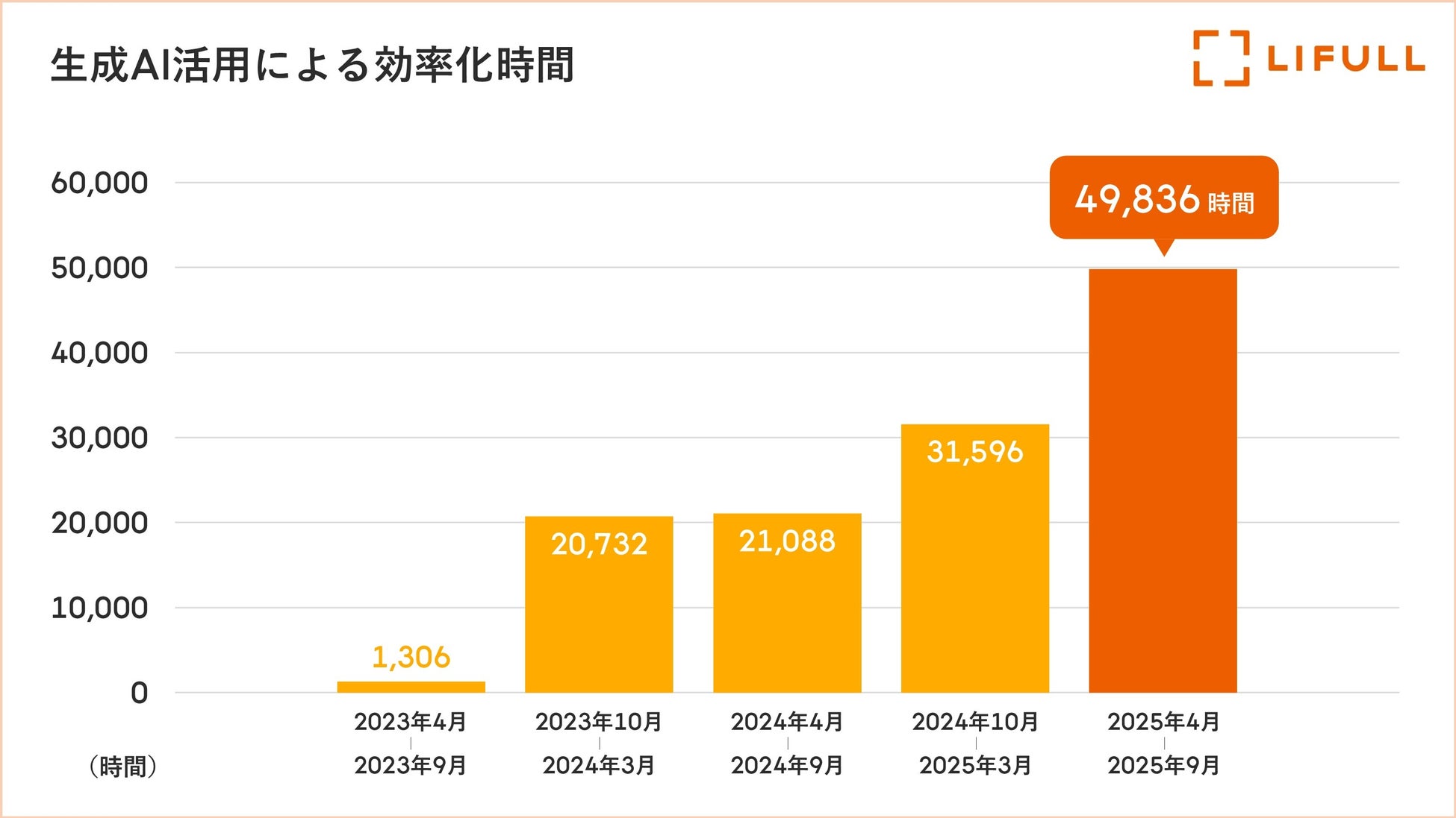 事業を通して社会課題解決に取り組む、株式会社LIFULL(本社:東京都千代田区、代表取締役社長:伊東祐司、東証プライム:2120)は、社内で推進する生成AI活用プロジェクトにおいて、業務効率化時間の増加とAI活用日数の増加により、2025年4~9月の半年間で過去最高となる約50,000時間の業務時間を創出しました。生成AI活用によって業務効率化できている従業員は96.2%まで増加しており、2年間で2.7倍となっています。