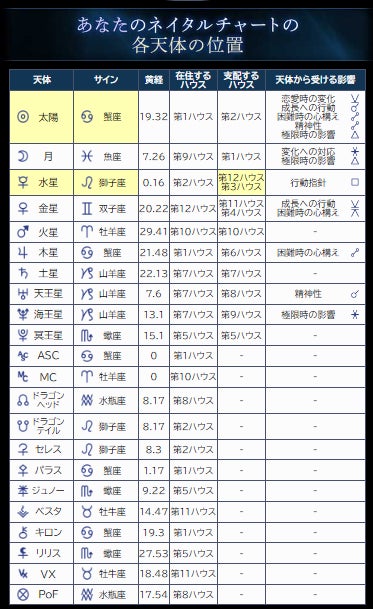 本ページでは天体位置を精密な計算を基に配置していきます。12星座、太陽系の惑星や、アステロイドと呼ばれる小惑星。ハウスやアスペクトなどを用いて鑑定していきます。