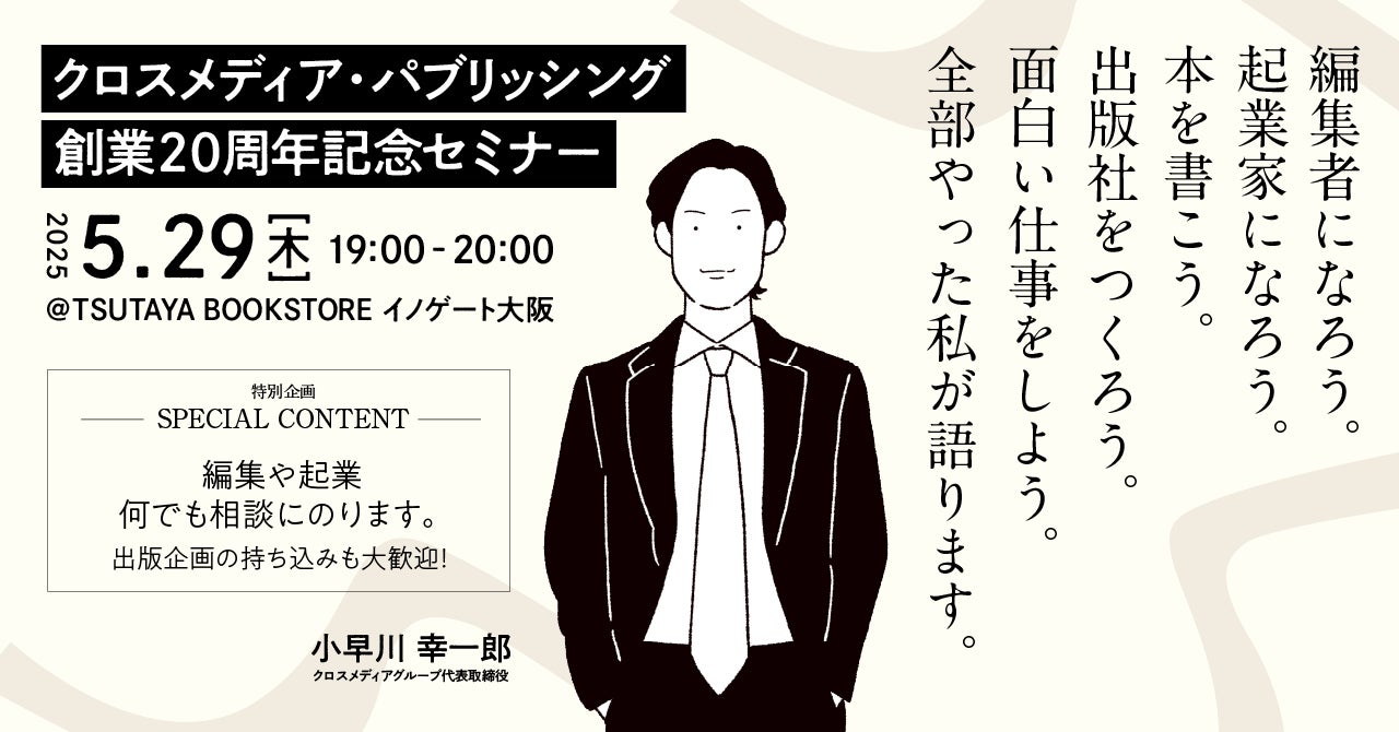 ビジネス書や実用書を中心に出版する株式会社クロスメディア・パブリッシング(本社:東京都渋谷区、代表取締役社長:小早川幸一郎)は、今年創業20周年を迎えます。この節目の年にあたり、代表取締役社長・小早川幸一郎が自身のこれまでの経験をもとに、「編集」「出版」「起業」「経営」について語る記念セミナーを開催いたします。
